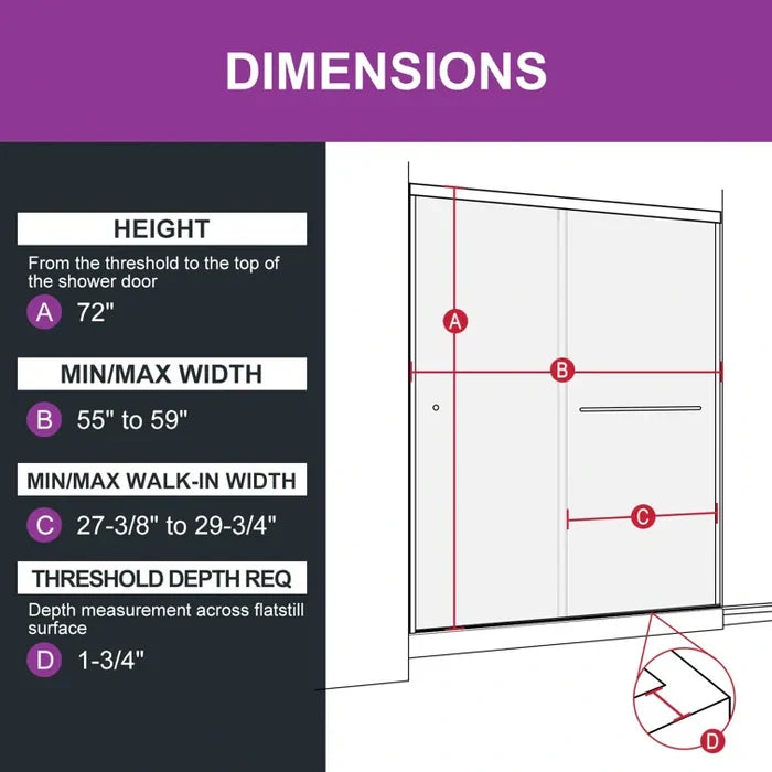 59 Inch: The 59-inch glass shower door works well for typical bathroom dimensions and provides easy access to shower areas.