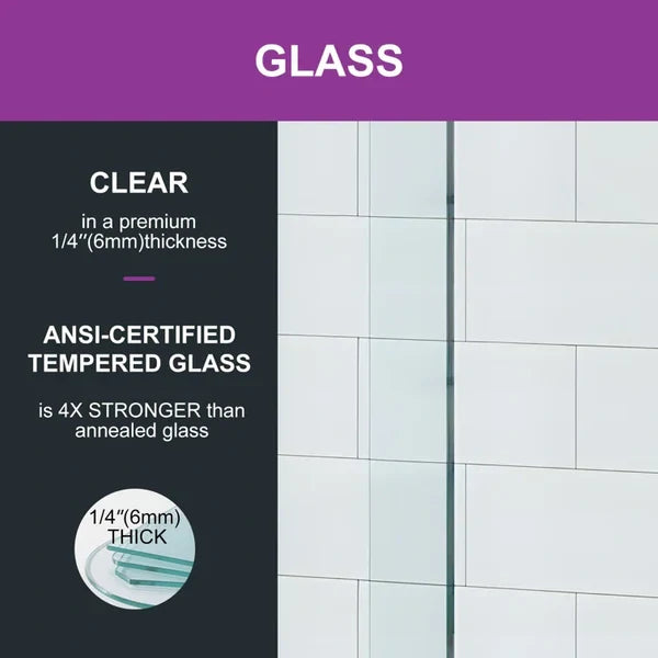 The ANSI-certified tempered glass material used for our sliding shower doors provides both safety and durability features. The glass material resists breakage while shattering into small harmless pieces when it does break.