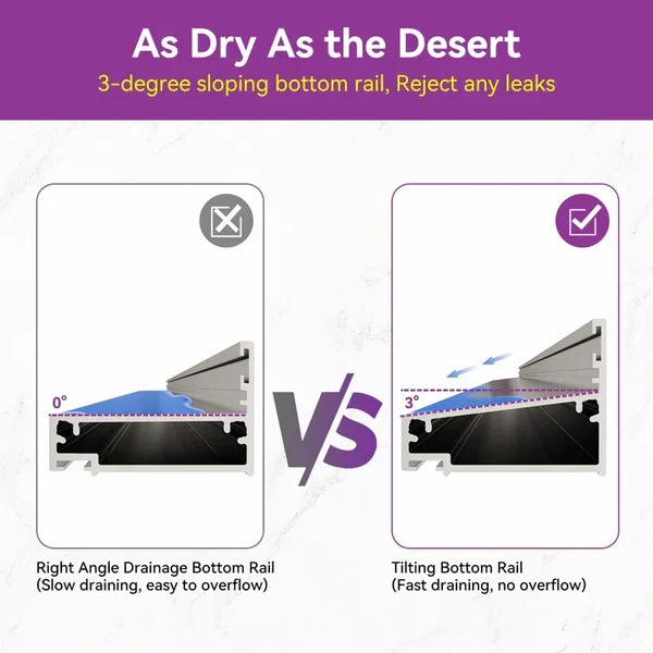 The 3-degree sloping bottom rail is designed to prevent water leakage, so that water does not leak out of the shower area and cause water damage to your bathroom.