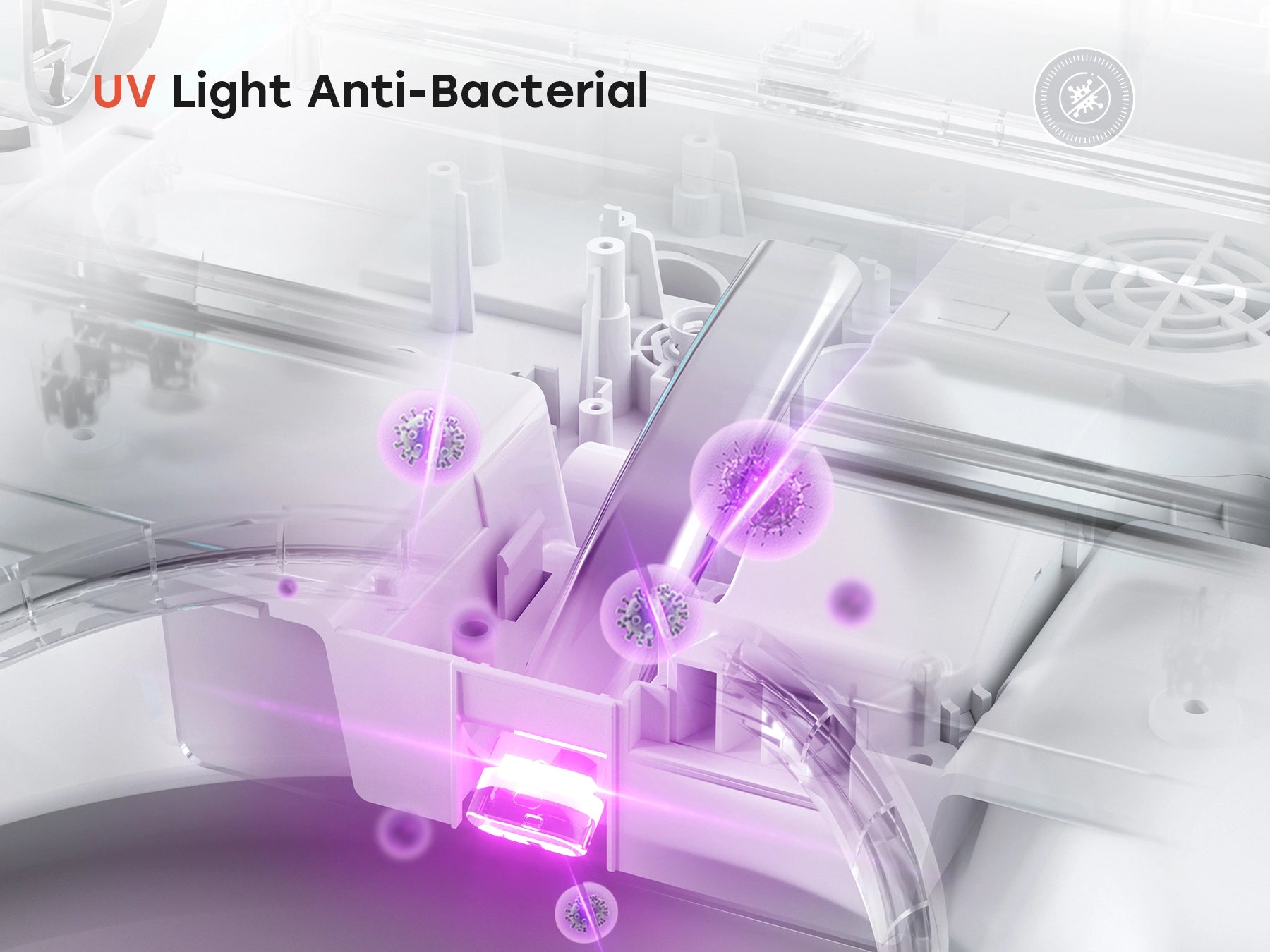 Built-in UV light helps kill bacteria on the nozzle—automated and chemical-free.