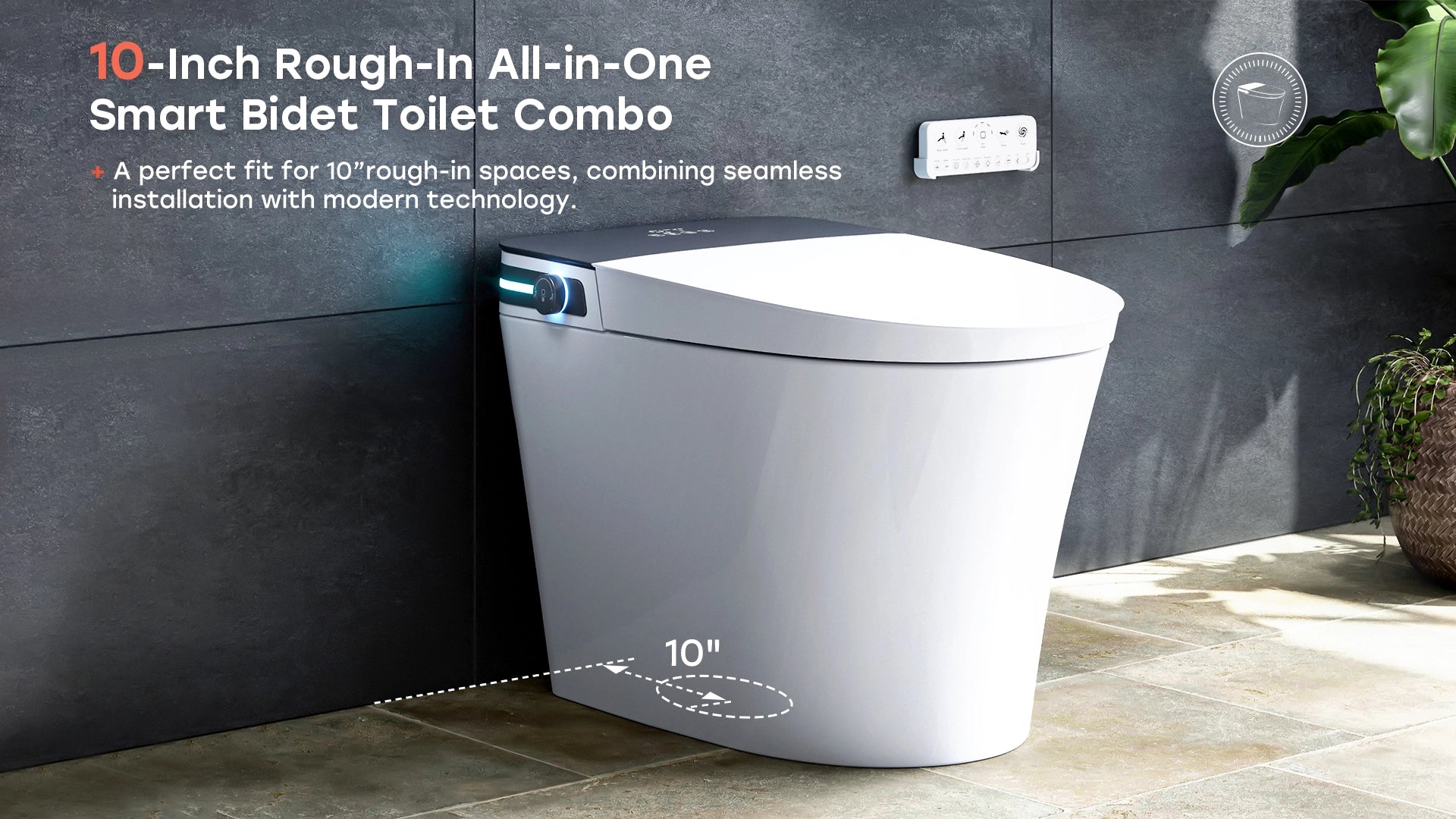 The HOROW T37D is a compact 10-inch rough-in toilet with a built-in bidet, ideal for modern bathrooms. It features an easy-to-use side knob for wash and dry control, a self-cleaning nozzle for hygiene, and a warm air dryer for added comfort. Even during power outages, it still flushes reliably. With its sleek, space-saving design, the T37D offers both style and smart functionality—perfect for any home.