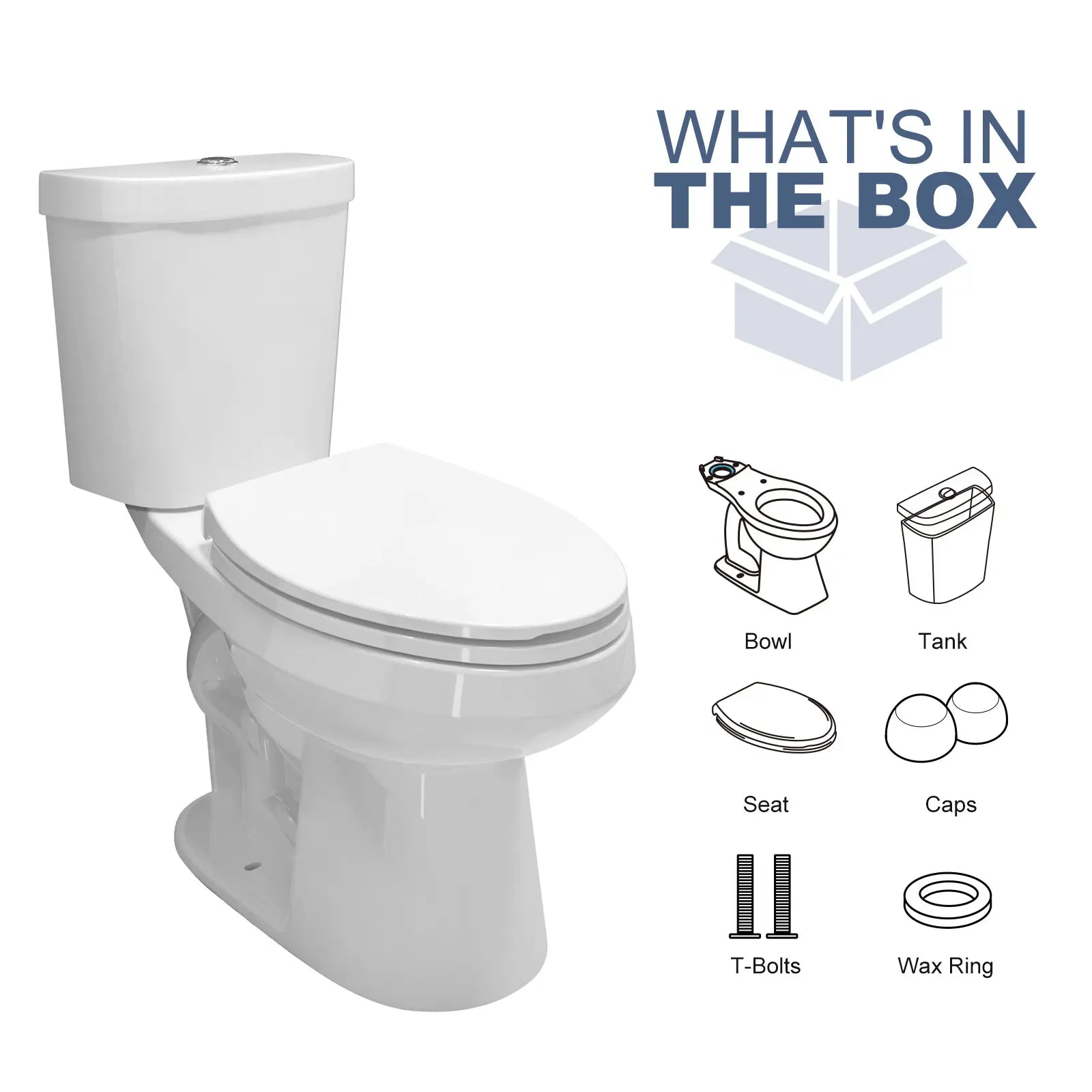 Tank, bowl, trip-lever, seat with lid, speed connect tank-to-bowl coupling kit, bolt caps, and wax ring.