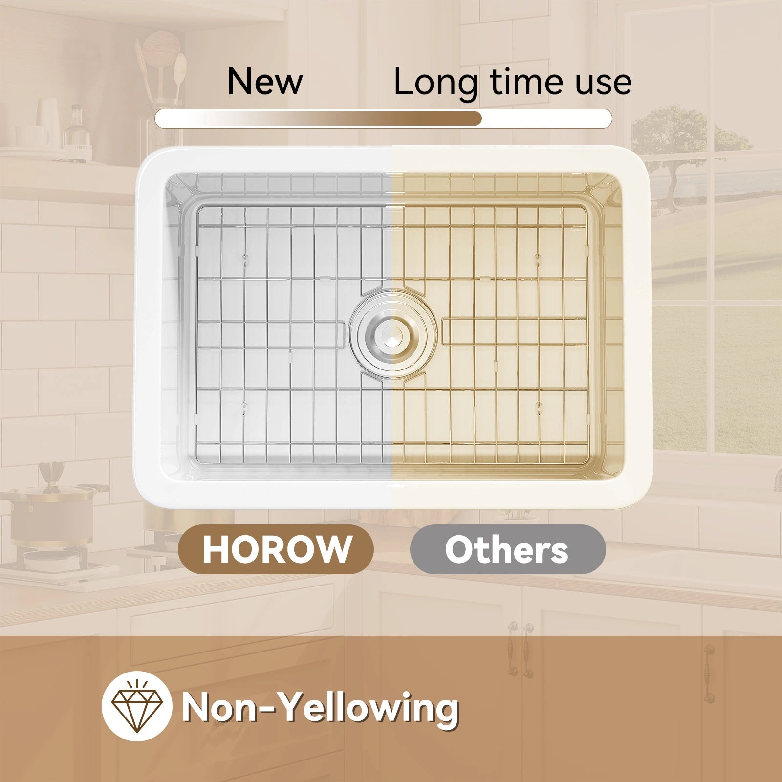 The HOROW S2719W 27-inch dual-mount kitchen sink combines style and functionality. Its glossy, non-porous finish resists stains, while the deep basin ensures ample space. Built to last, it features a non-yellowing surface for enduring brilliance.
