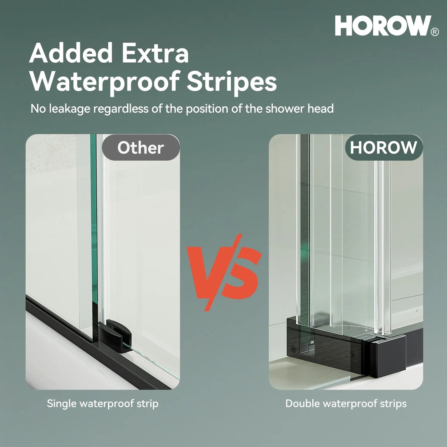 The HOROW MI6076-MB Black Sliding Shower Door features a 60-inch frameless design with 8mm thick tempered glass, a wing-shaped waterproof strip, and extra waterproof stripes for a sleek, leak-resistant, and modern upgrade to any bathroom.