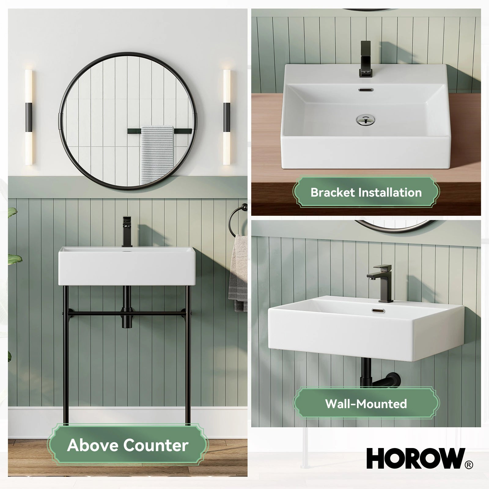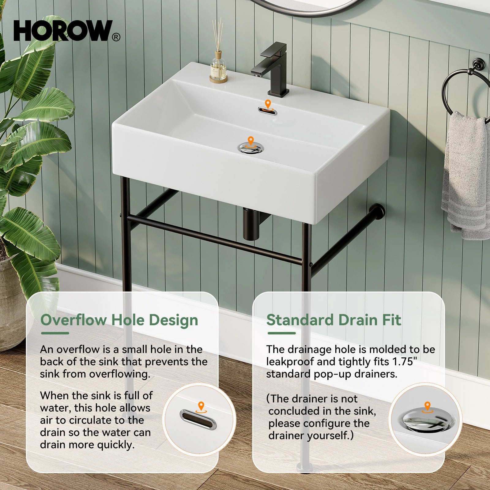 The HOROW CS6042-MB Console Sink combines sleek design with durable functionality, perfect for modern bathrooms. Featuring a minimalist sink with stylish black metal legs, this unit offers a contemporary aesthetic that elevates any space, The included drain fit ensures seamless installation, while the sink’s high-temperature and oil-resistant surfaceguarantees long-lasting durability and easy maintenance. Its compact designmakes it ideal for small or large bathrooms, blending elegance withpracticality. Crafted for performance and style, the HOROW CS6042-MB is aversatile addition to enhance your bathroom experience. Upgrade your spacewith this blend of beauty and resilience.