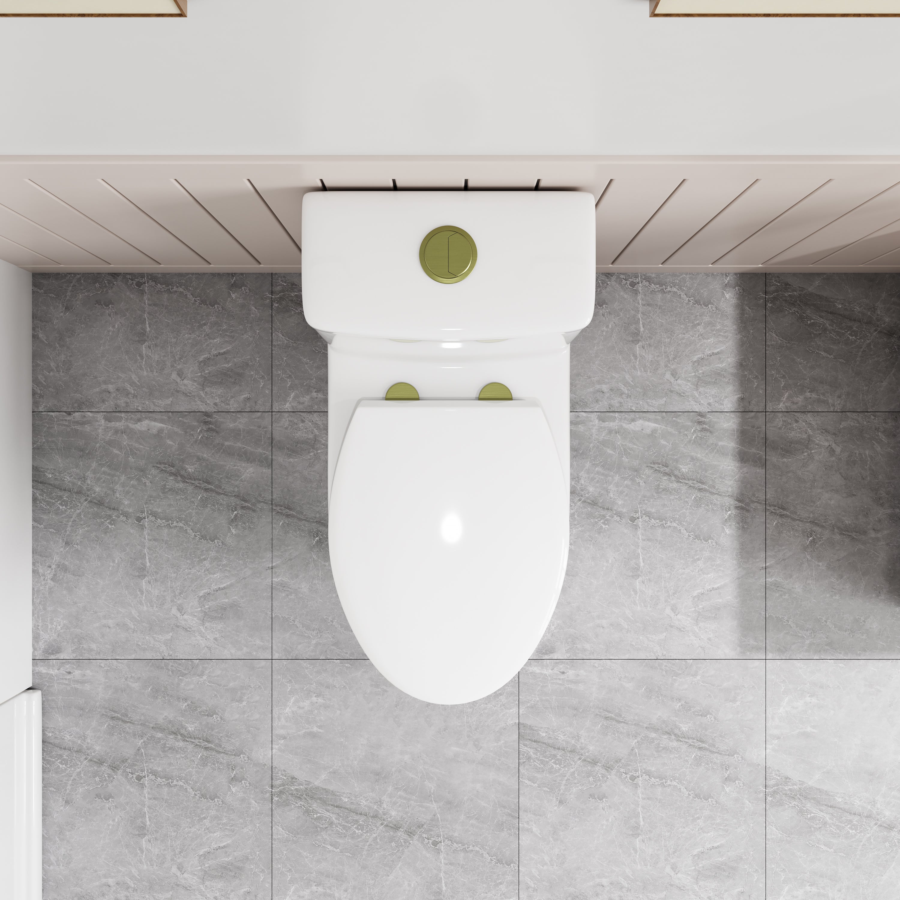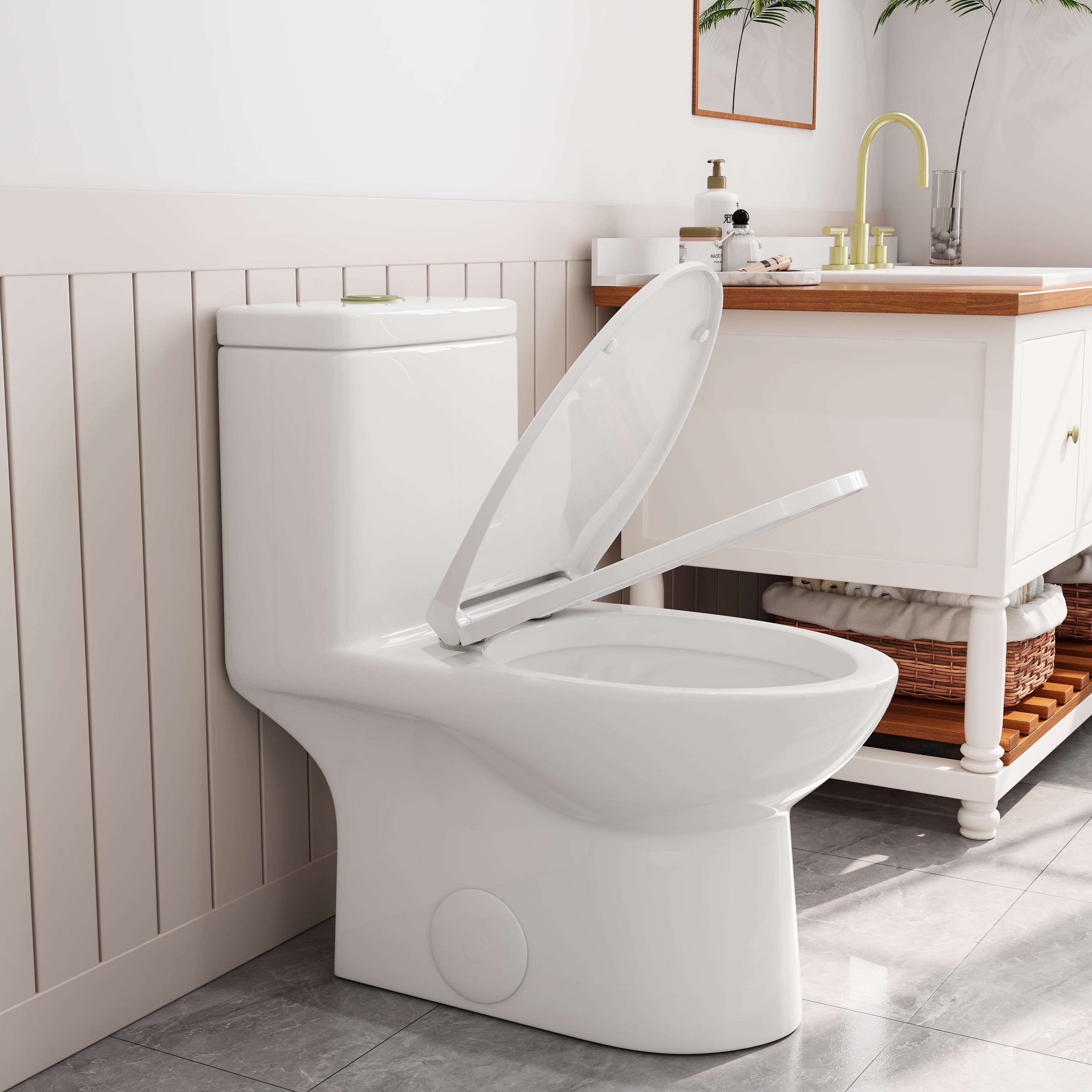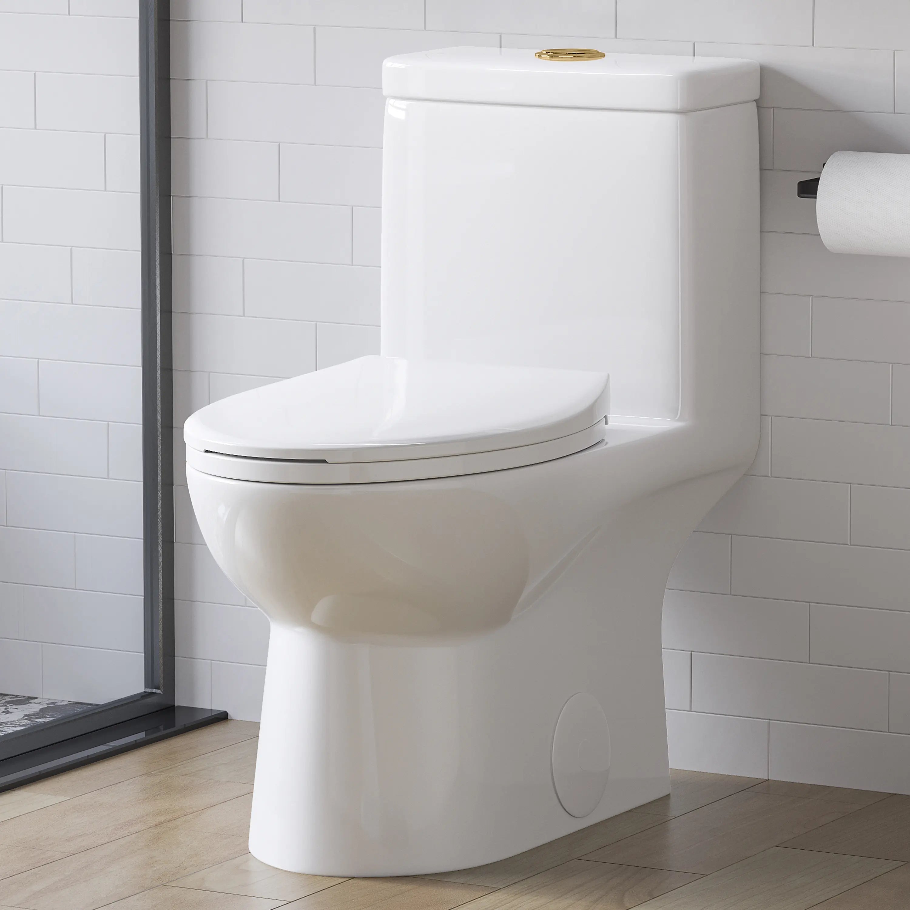 The HOROW T0337W-G Toilet features a stylish gold flush button, soft-closing PP seat, and is designed for a standard 12-inch rough-in. Its modern design and quiet operation make it a perfect fit for elegant, contemporary bathrooms.