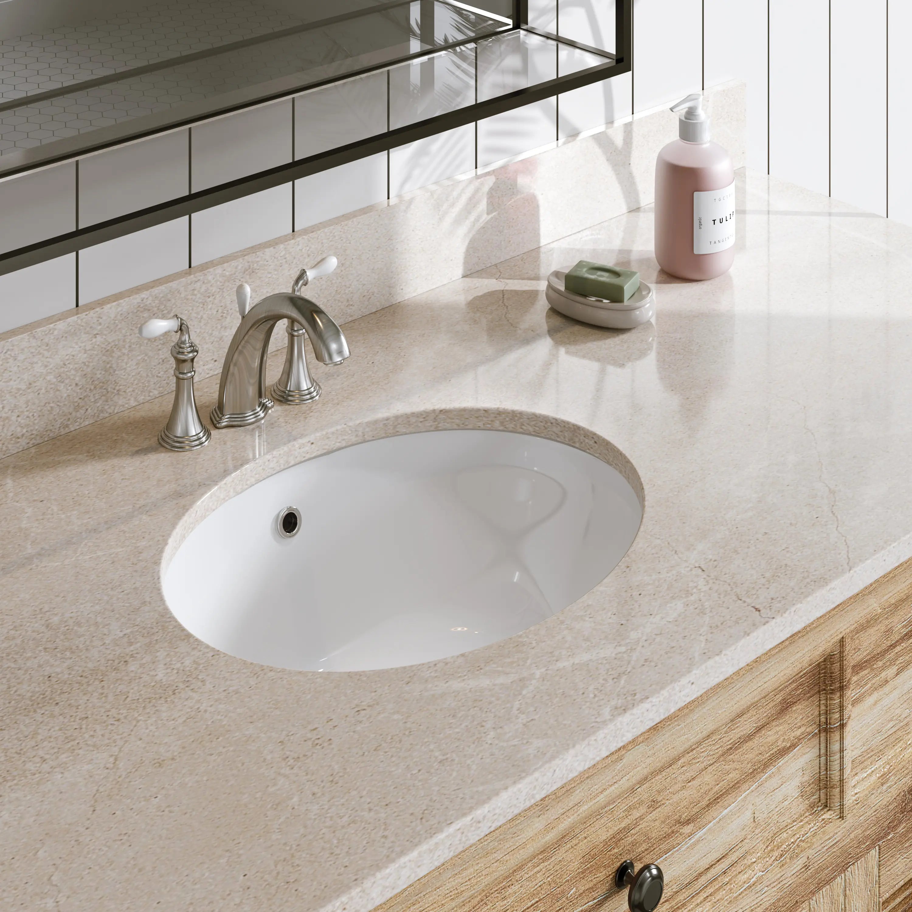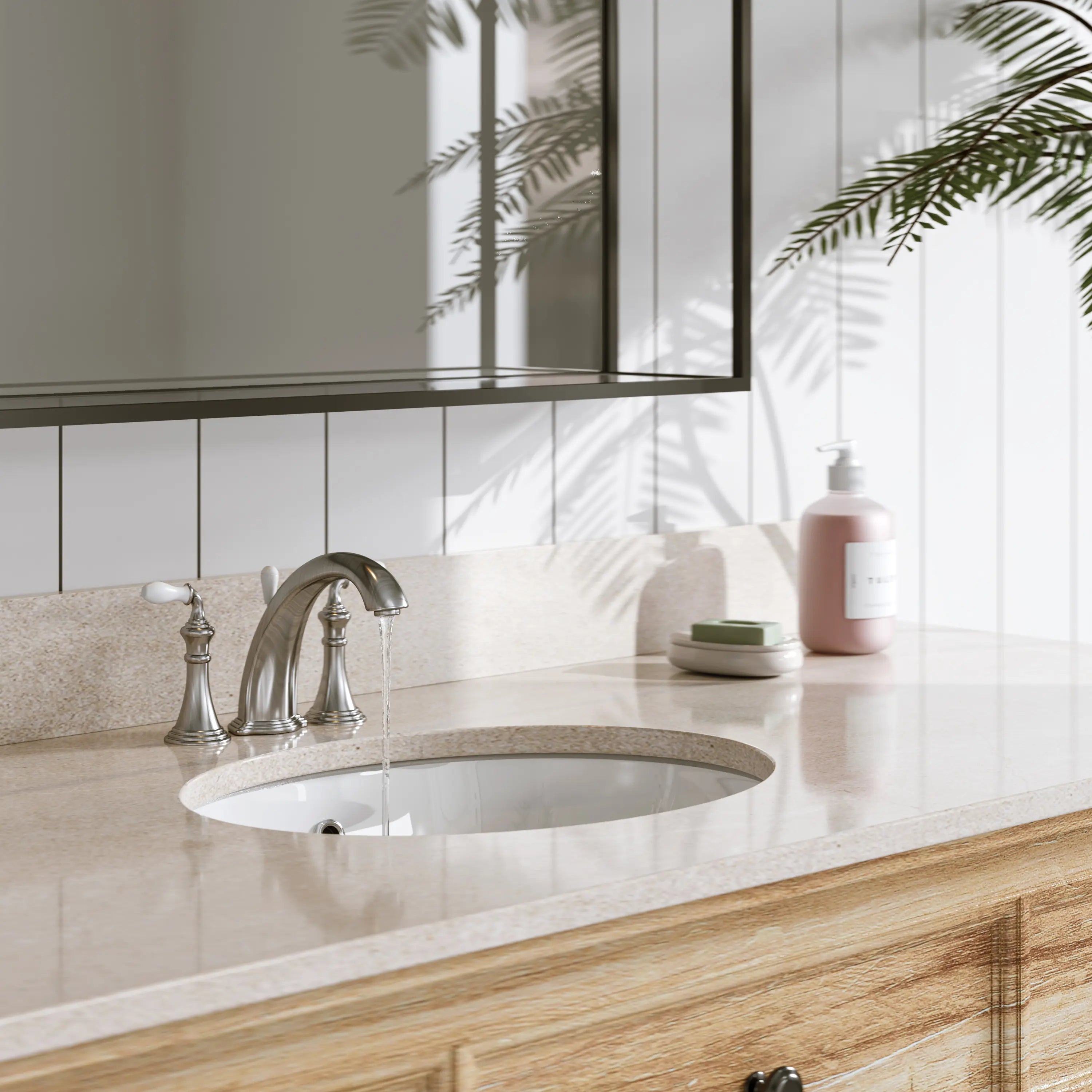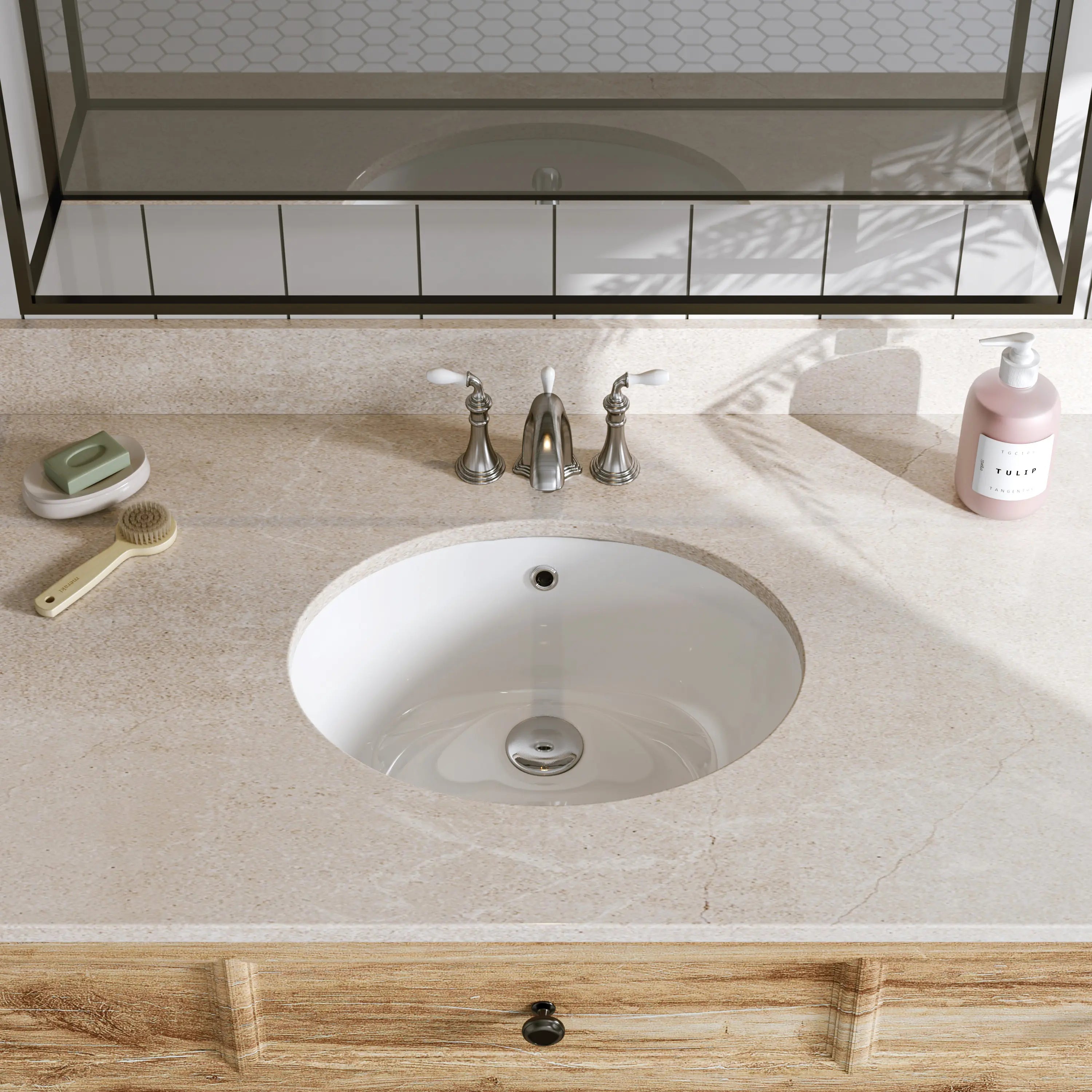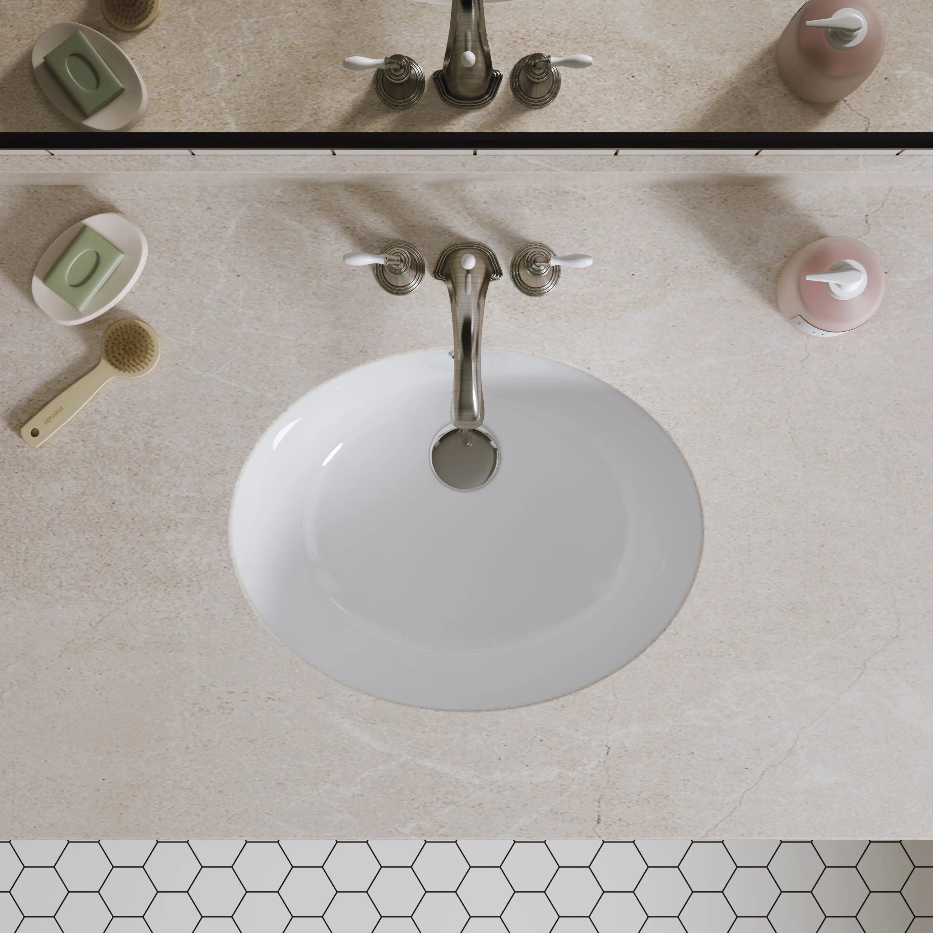 Featuring a classic oval shape, this undermount sink is crafted with premium vitreous china for low water absorption, acid resistance, and a smooth, polished surface that resists scratches and stains.