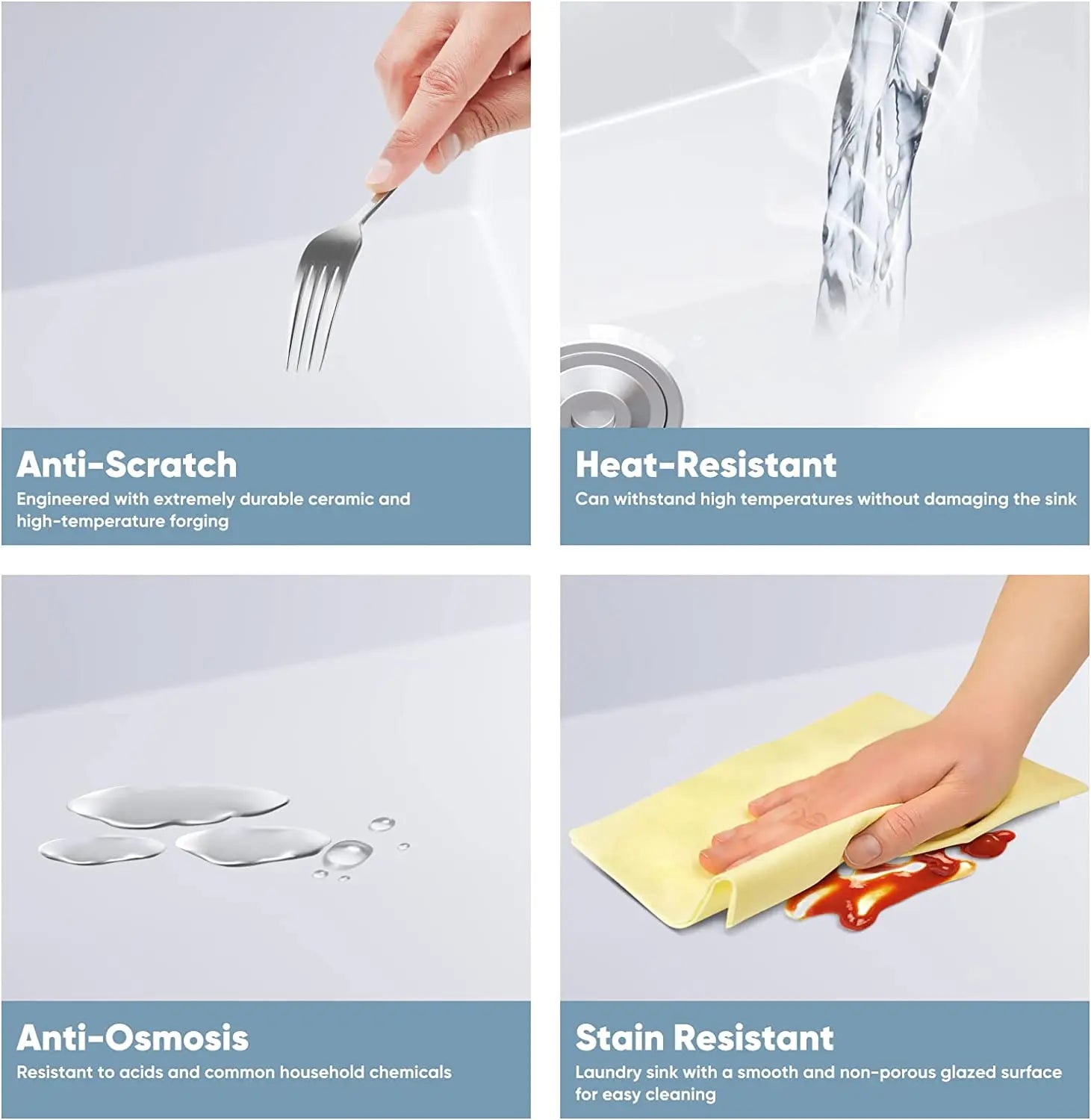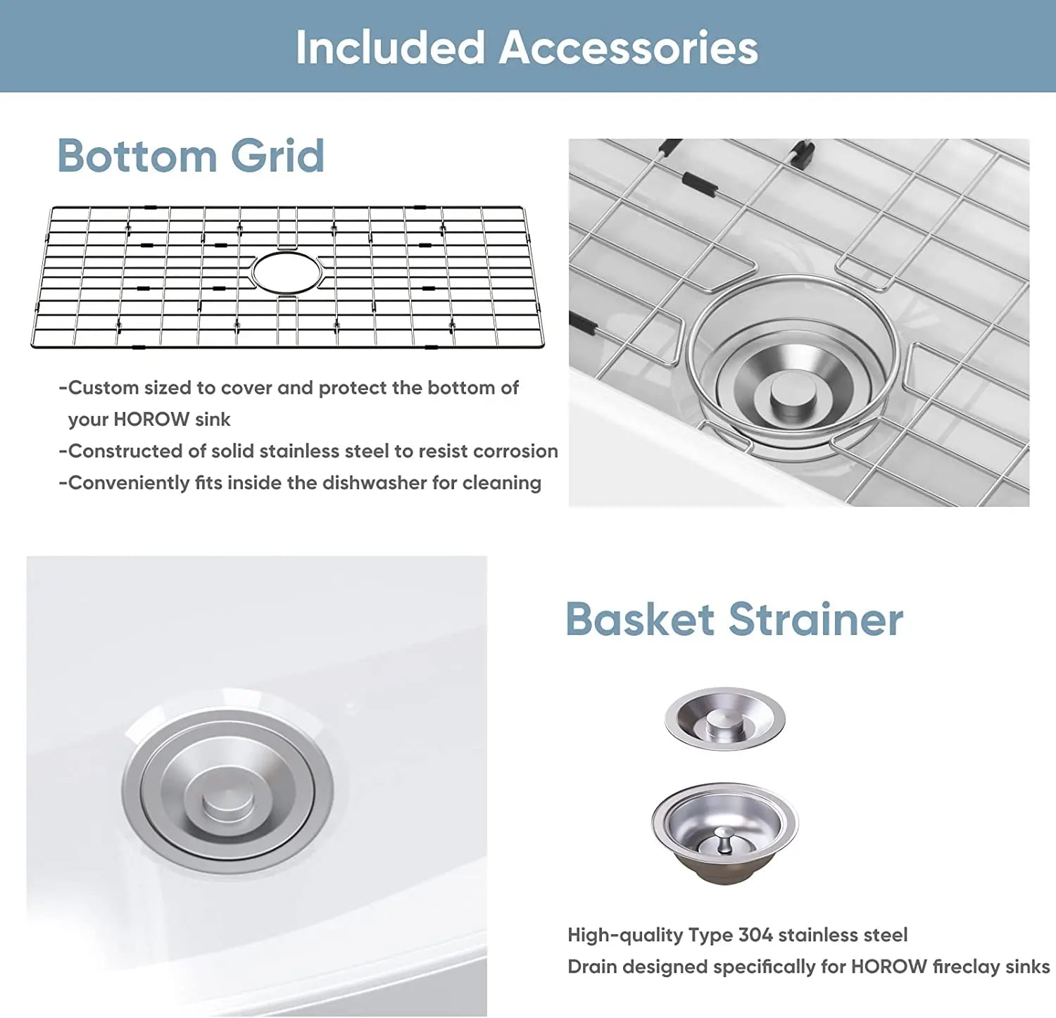 Our farm ceramic sink comes with a complete set of premium accessories, including a stainless steel dish grid, a 3-piece drain set, and mounting hardware. The custom bottom grid prevents chipping, and the 3.5-inch drain opening accommodates standard garbage disposal units in the US.