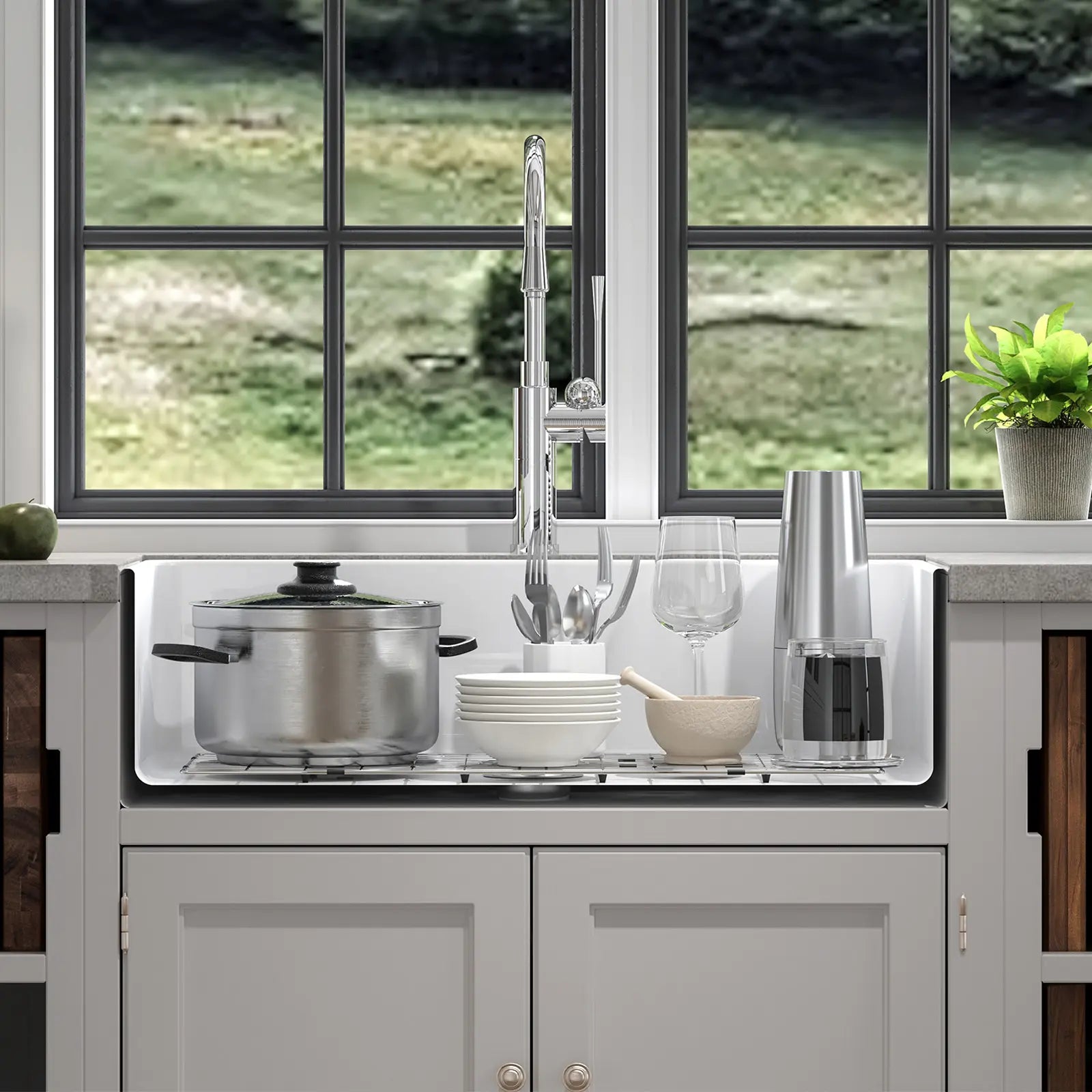 Elevate the aesthetic of your kitchen with our handcrafted 36-inch farmhouse sink, designed in a classic white hue that embraces the beloved farmhouse style and sets the tone for your home.