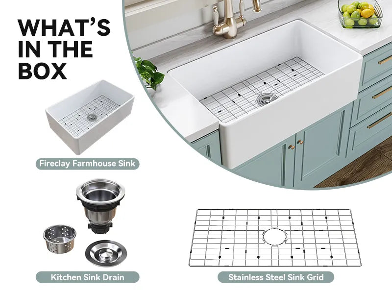 Our farm ceramic sink comes with a complete set of premium accessories, including a stainless steel dish grid, a 3-piece drain set, and mounting hardware. The custom bottom grid prevents chipping, and the 3.5-inch drain opening accommodates standard garbage disposal units in the US.