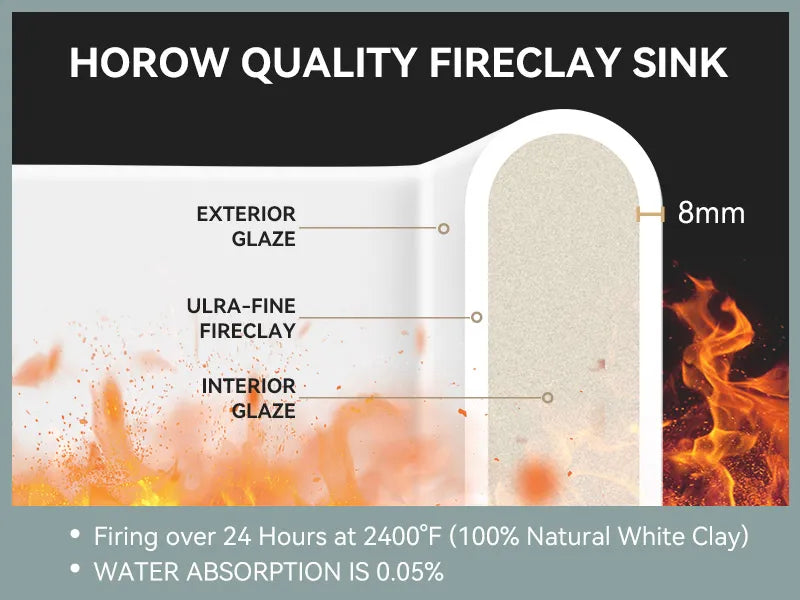 This farmhouse sink is made from white clay fired at 24 hours at 2400°F for a tough, smooth surface and durability.