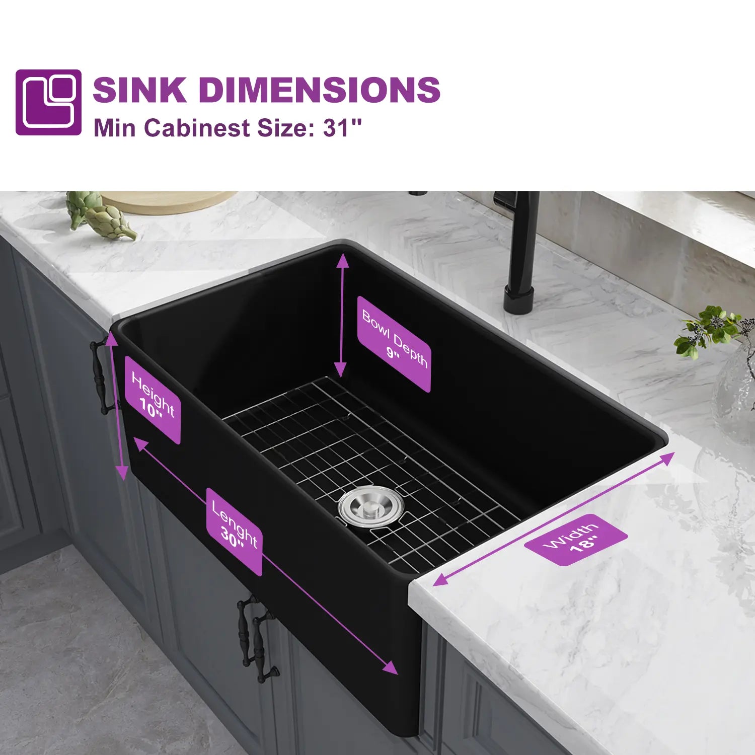 The 30 inch farmhouse sink has always been our go-to for the perfect size sink. A reasonably sized sink not only takes up less space, but is also sufficient for most dishwashing tasks. On top of the original basic functions, the S3018B sink provides a variety of reference solutions for different styles of stoves in black color. Solid ceramic one-piece high-temperature firing has good aesthetics and long service life. The special glaze coating and refractory clay fusion provide good stain resistance and a smooth surface.
