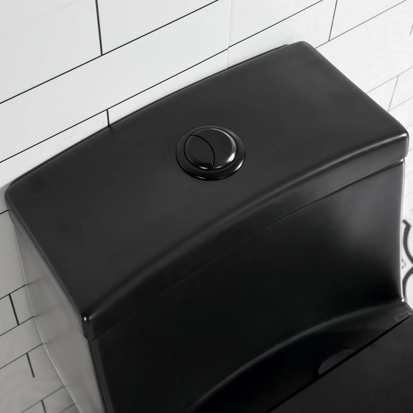 This matte black toilet enhances your modern bathroom with a contemporary back-to-wall design and concealed, visually appealing skirted features. It boasts a strong dual flush for reliable performance, easy installation and use, and includes a flush actuator at the top of the tank, ensuring comfort and security in your bathroom.