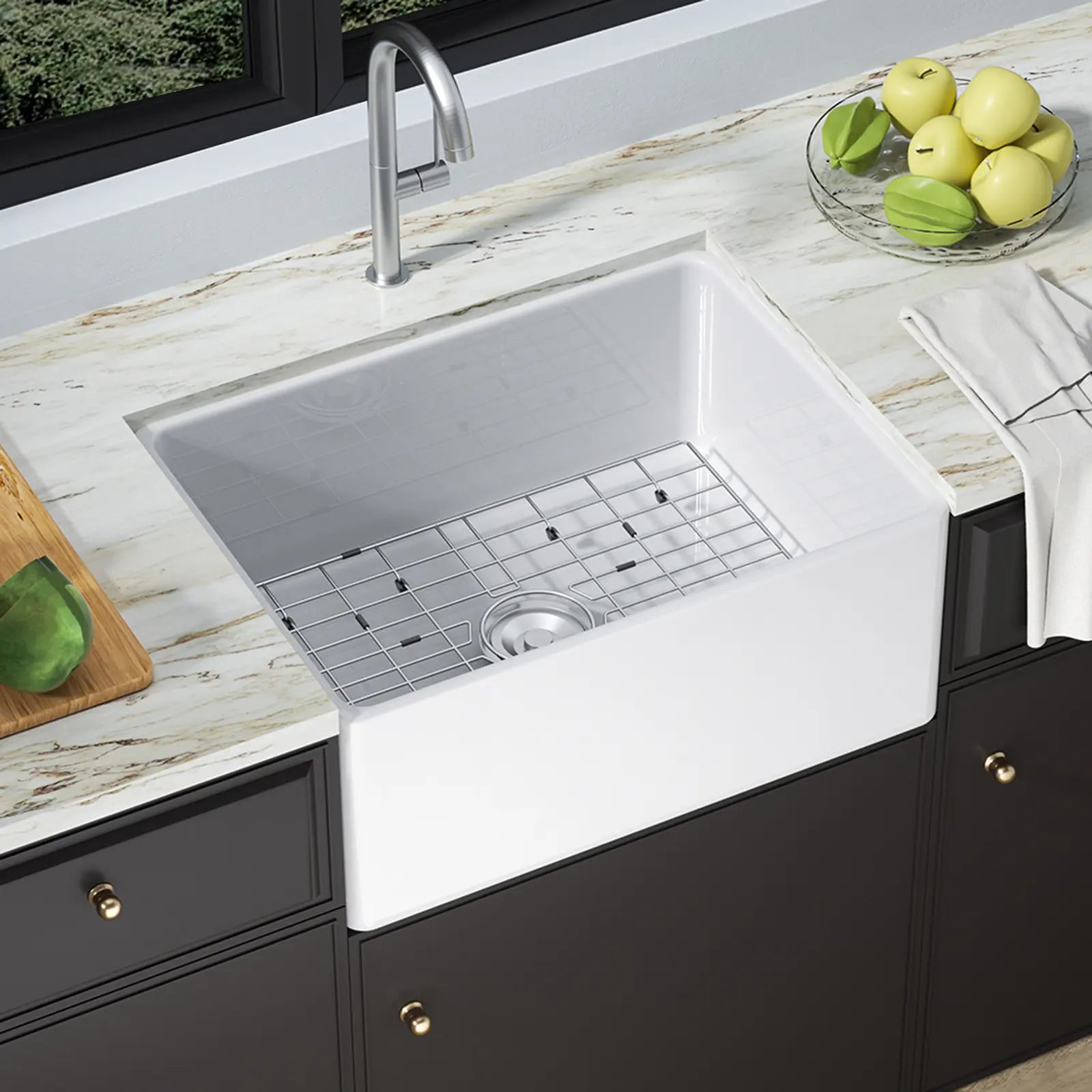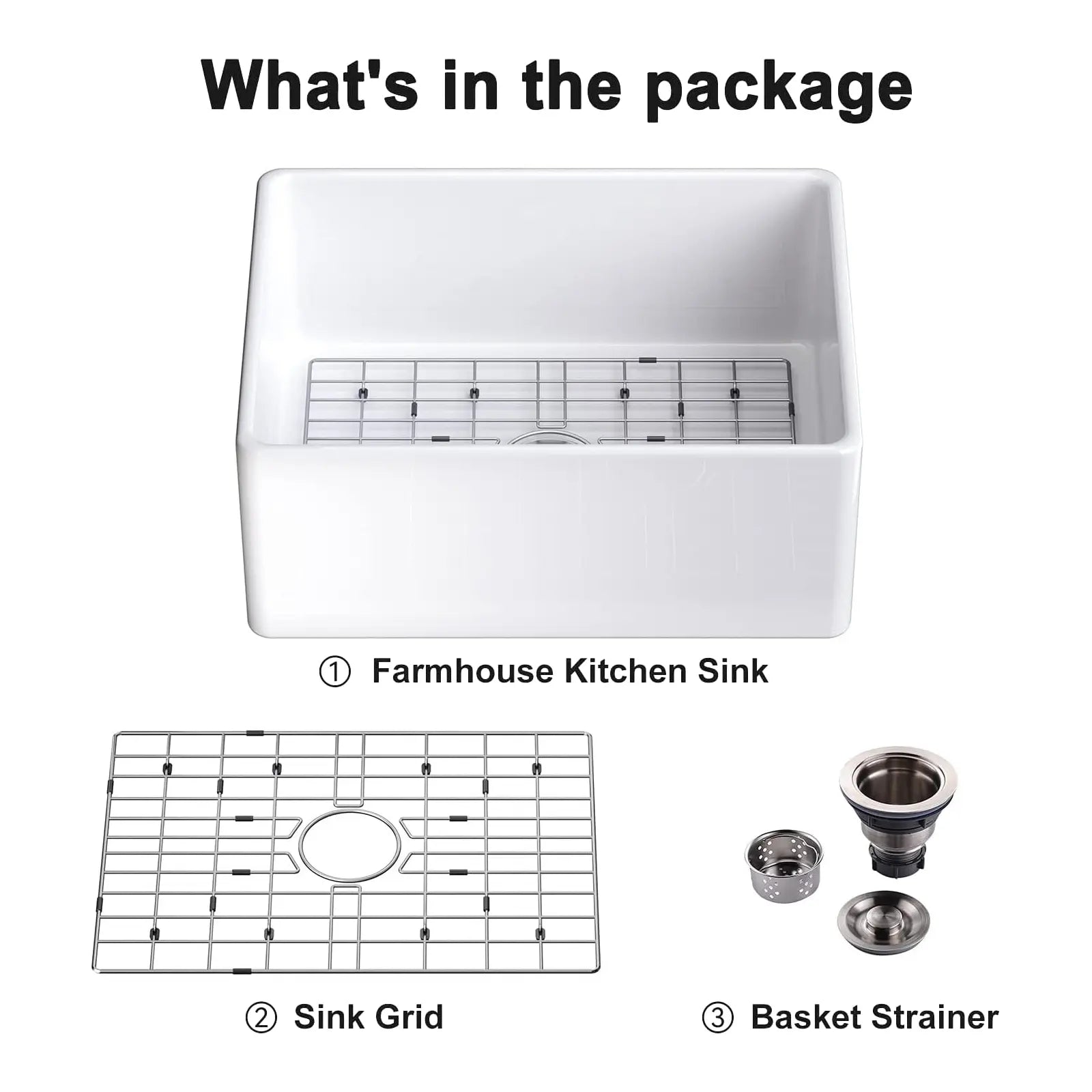 Our farm ceramic sink comes with a protective stainless steel dish grid, a 3-piece drain set, and mounting hardware, providing a complete solution. Enjoy a 1-year warranty and premium customer support, making your purchase risk-free.