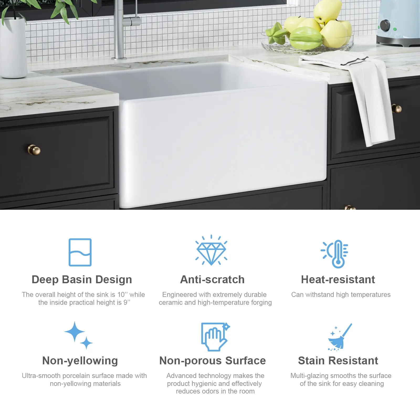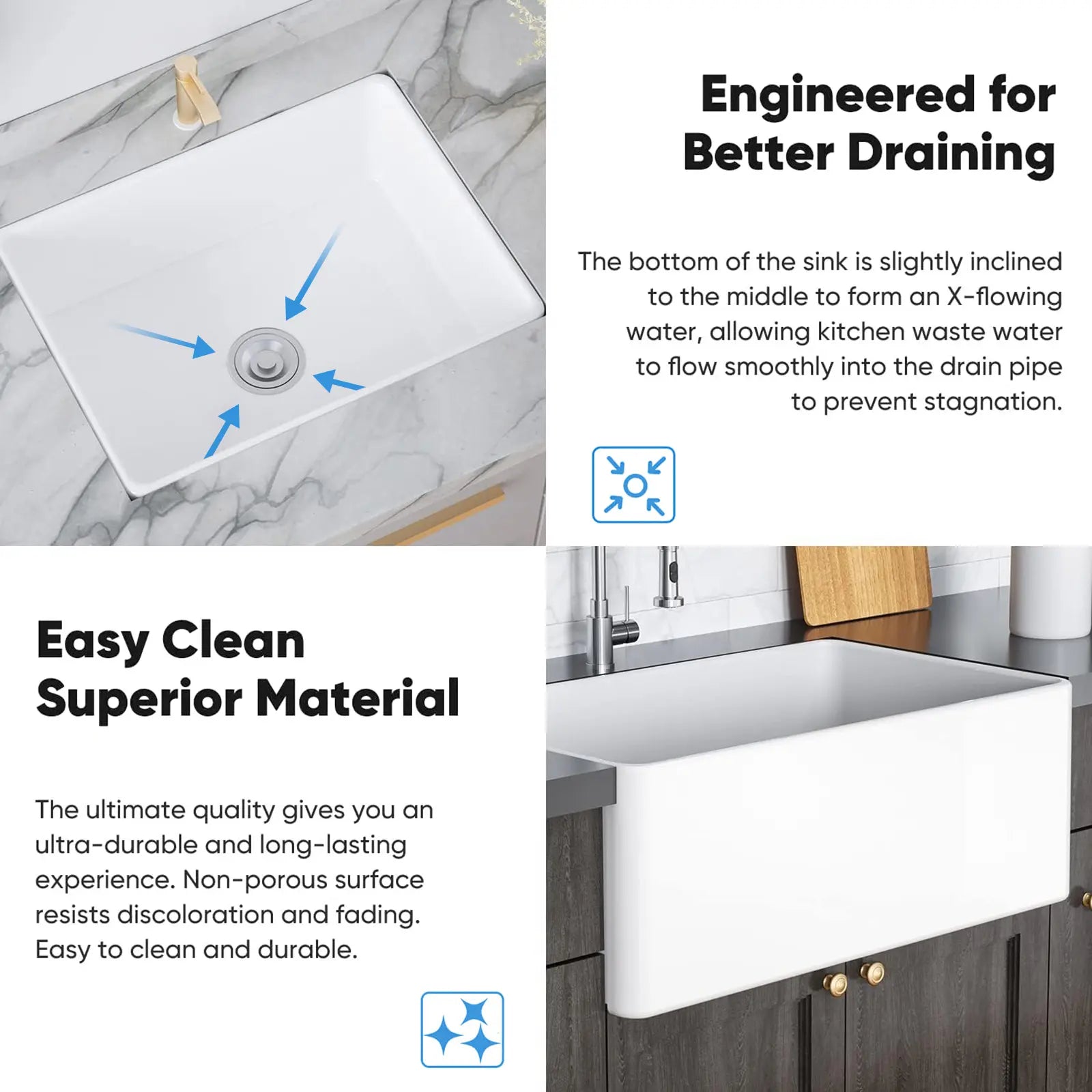 The fireclay farmhouse sink features rounded corners and an apron-front design, adding sleek and stylish appeal to any home. The smooth and non-porous glazed surface of the white undermount kitchen sink resists stains, making it easy to clean with soapy water and a sponge.