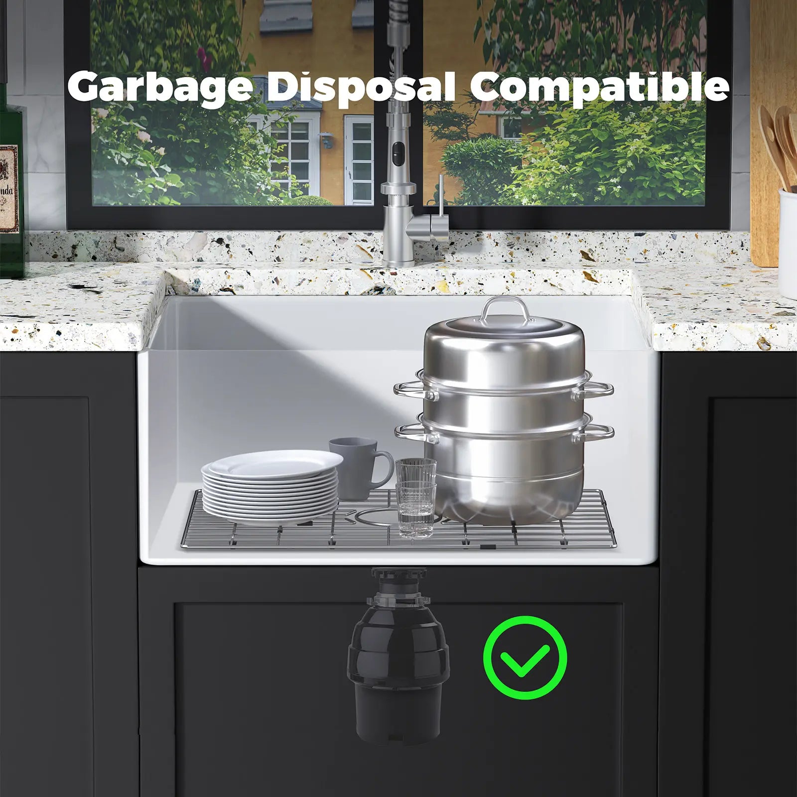 The 24-inch farmhouse sink features an optimized bottom slope, preventing water pooling and ensuring secure placement for fragile glassware. The 3.5-inch drain opening fits a standard garbage disposal unit.