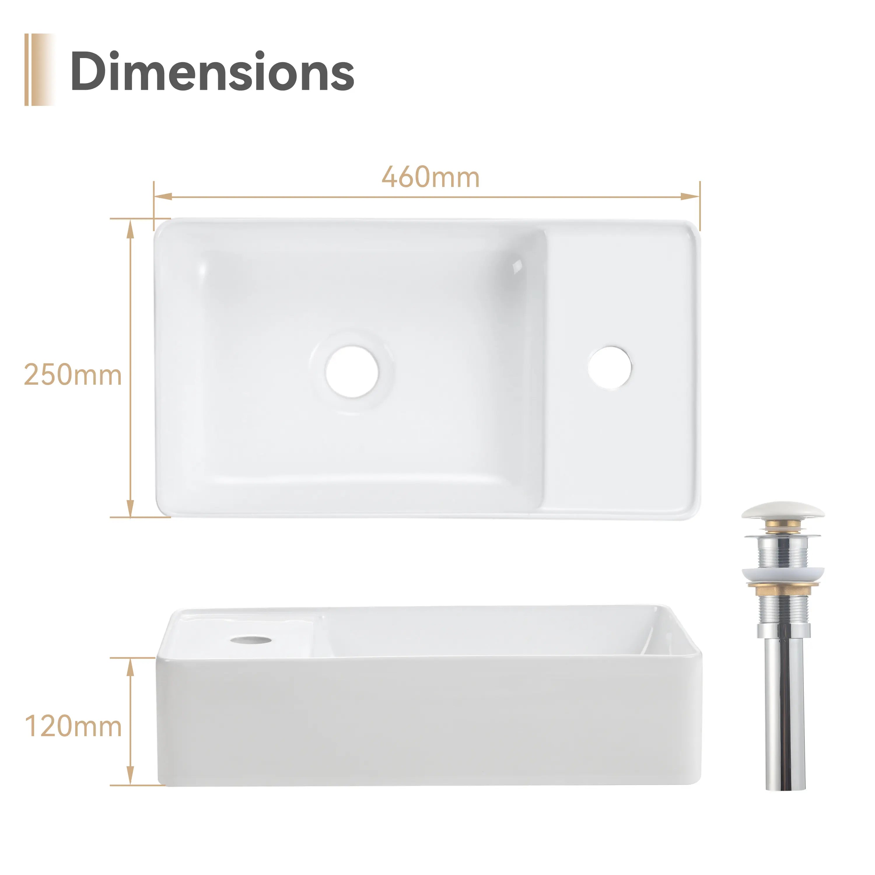 HOROW HWTP-S4625WL sink is a small wall mounted sink. White ceramic and three-layer glaze process ensure stability for long-term use. Dimensions are 18.11 inches long x 9.84 inches wide x 4.72 inches high, and it can fit a 17.5-inch drain outlet.