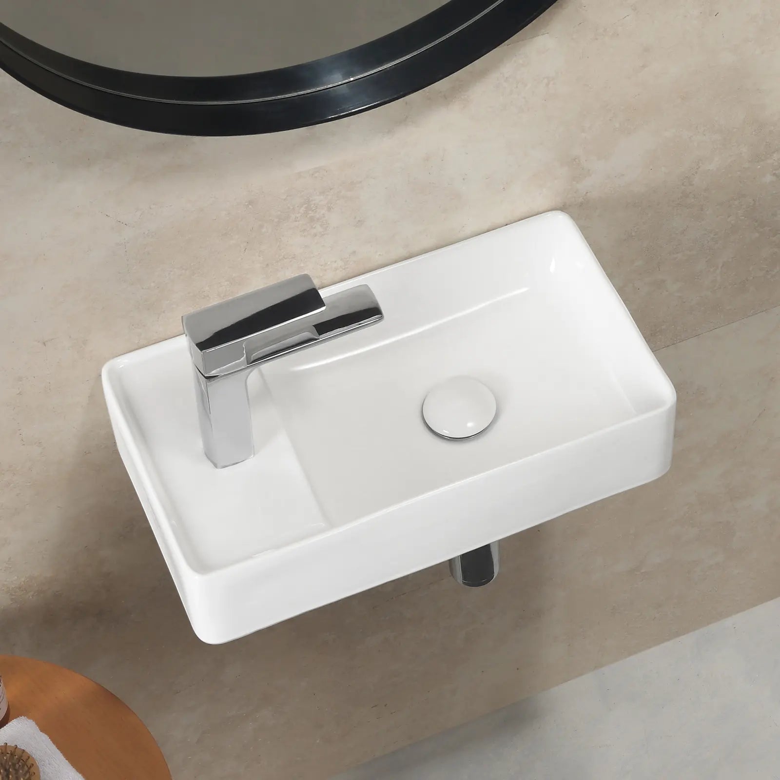 Elegant ceramic basin with a bright white luster, featuring a unique rectangle shape for corner installation, maximizing space in small to medium-sized apartments.