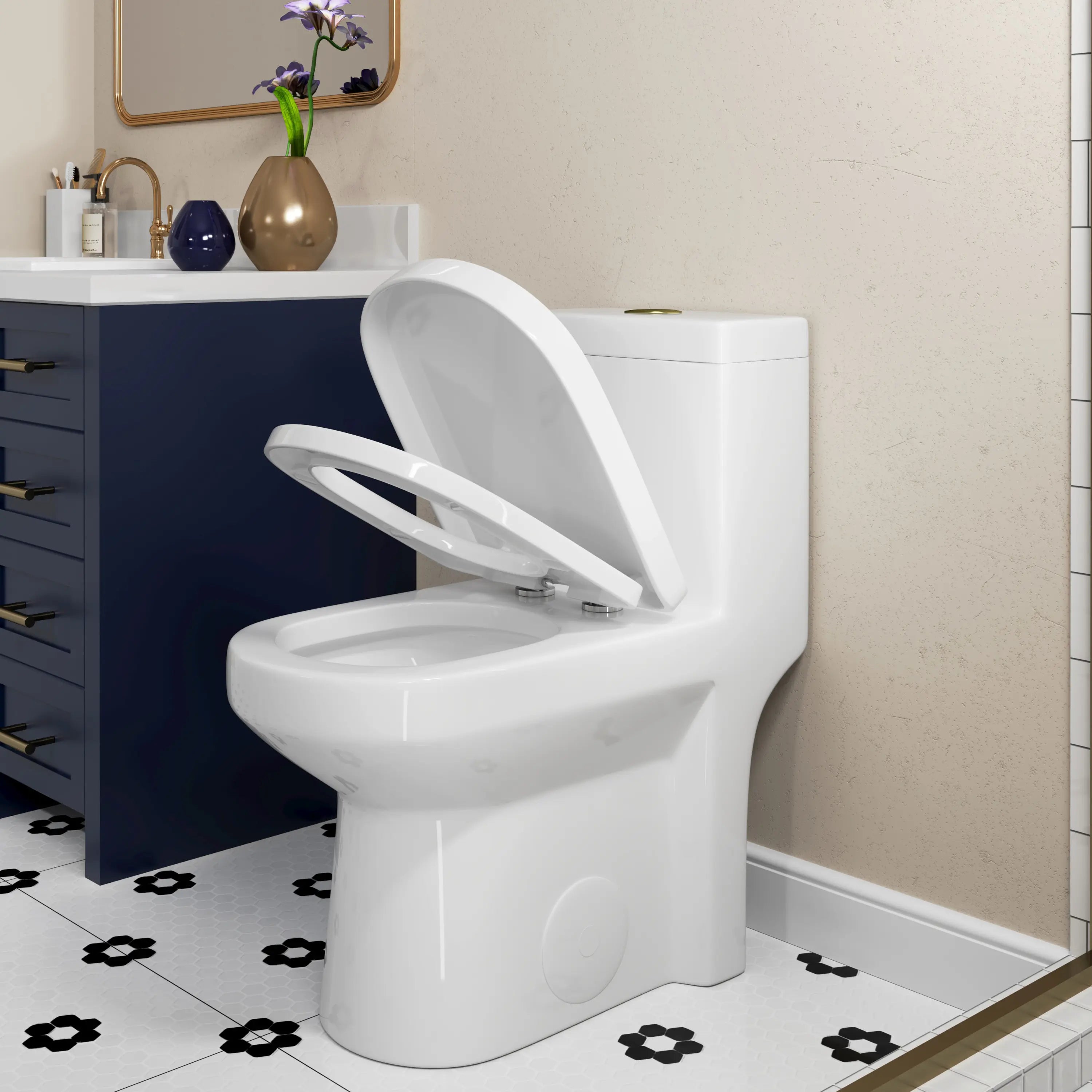 A smaller and shorter one-piece toilet, perfect for small bathrooms. The toilet seat is 2” shorter than a standard elongated seat, optimizing space.