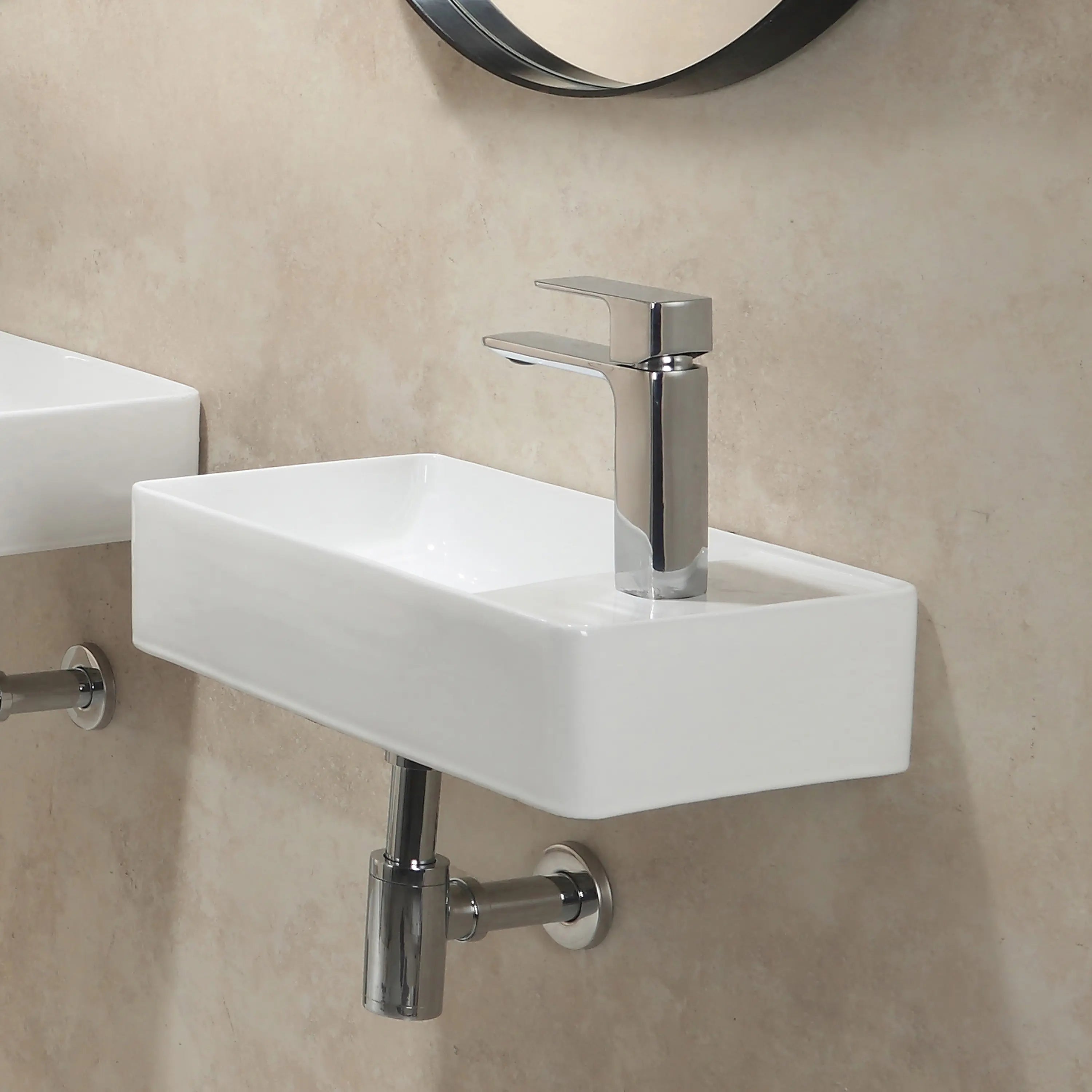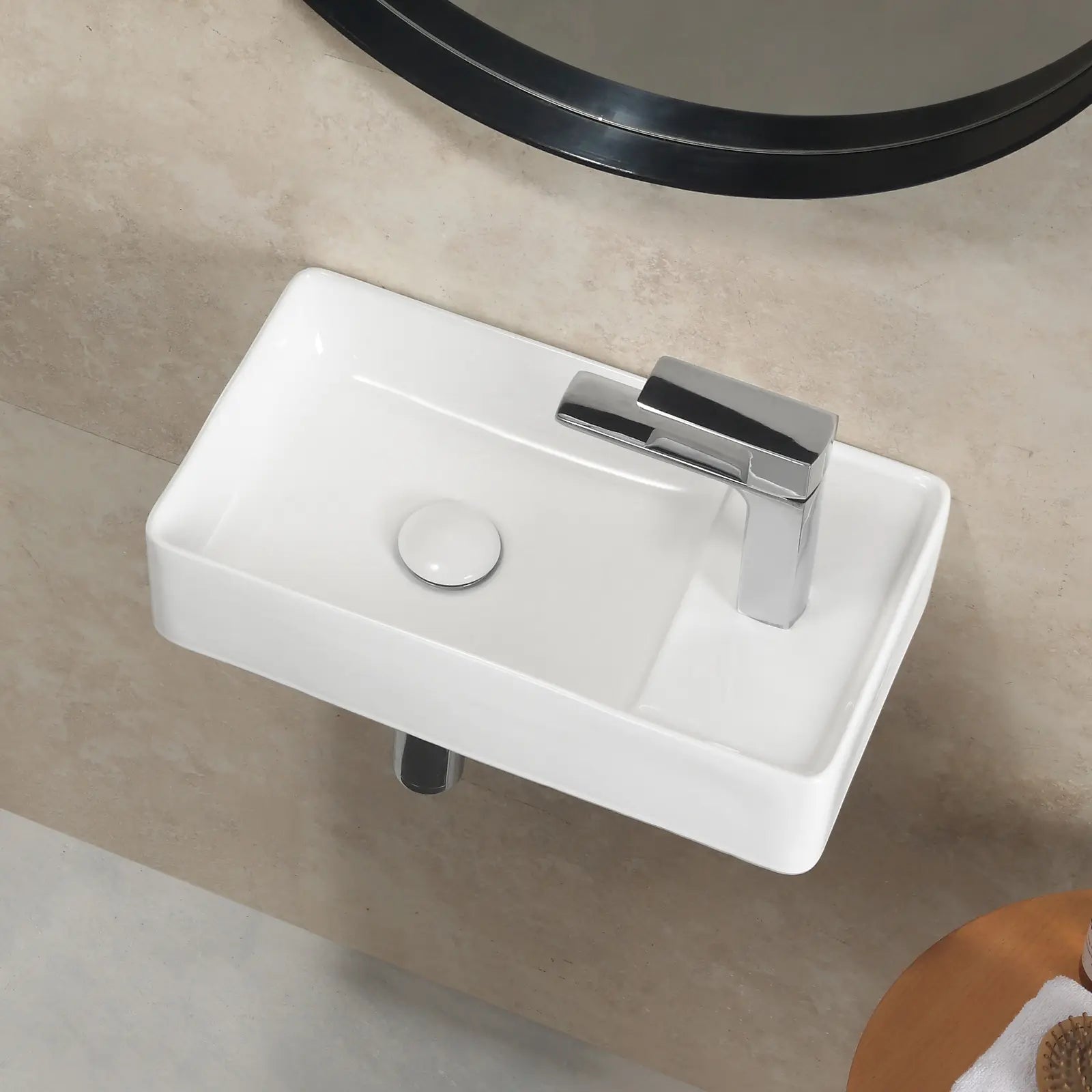 Simple and elegant ceramic basin with a bright white luster, perfect for any bathroom or bar dressing table. The unique rectangle shape allows for corner installation, maximizing space in small to medium-sized apartments.