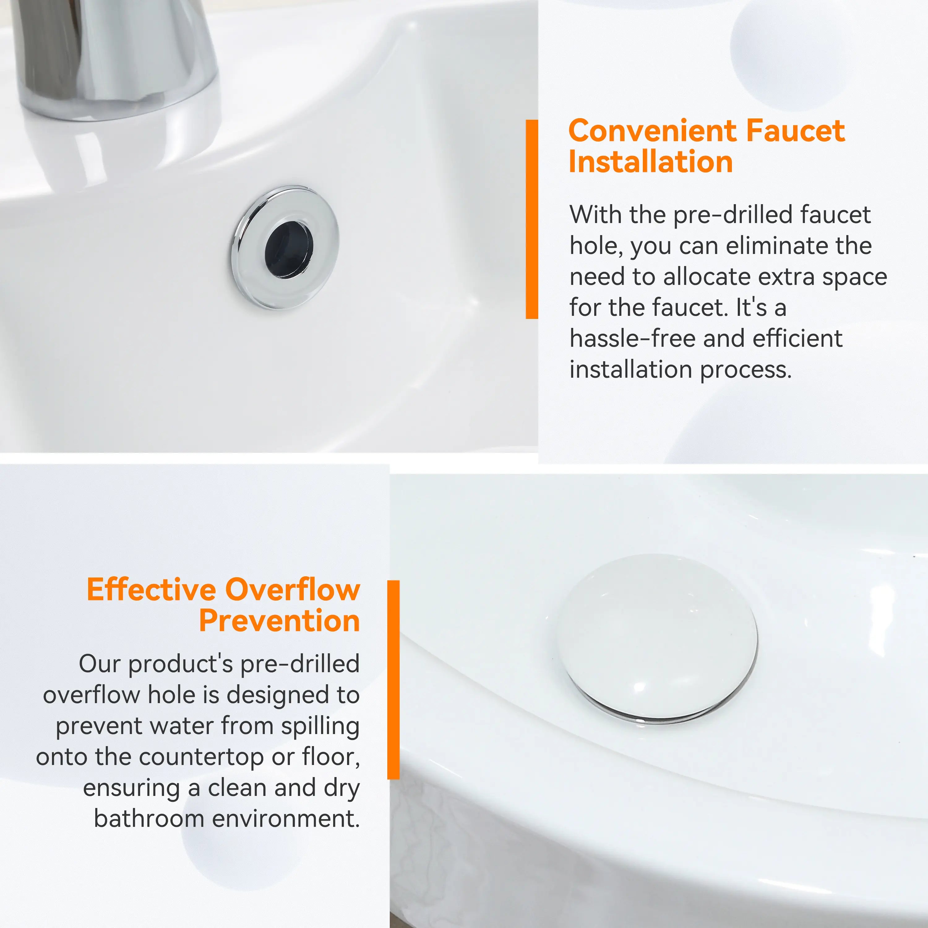 Features a round overflow to prevent water damage, with pre-drilled holes for standard single lever faucets at the center.
