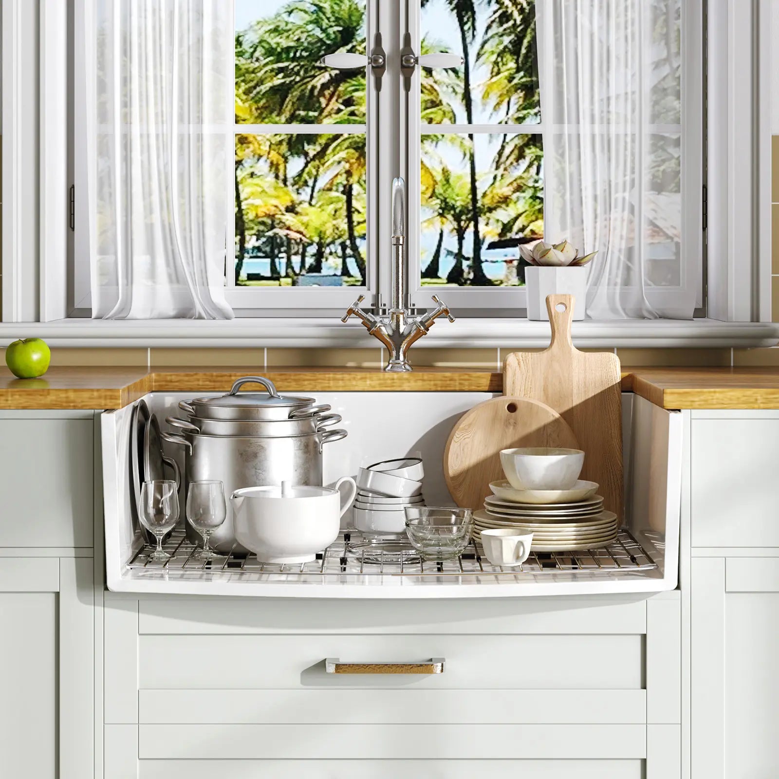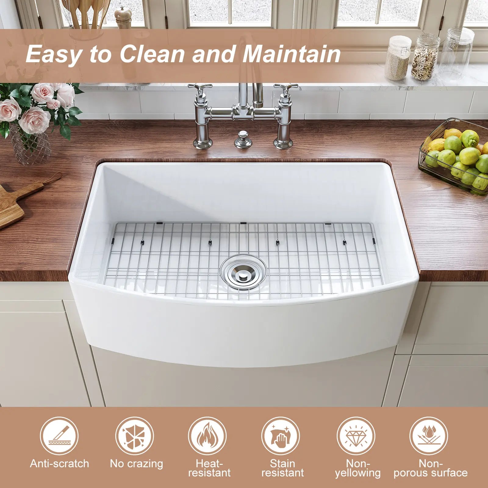 Elevate your kitchen aesthetics with our farmhouse sink featuring arch edges for both beauty and reliable performance. The sleek and smooth lines, along with round corners, not only facilitate easy cleaning but also add a decorative touch to your kitchen, highlighting your unique lifestyle.