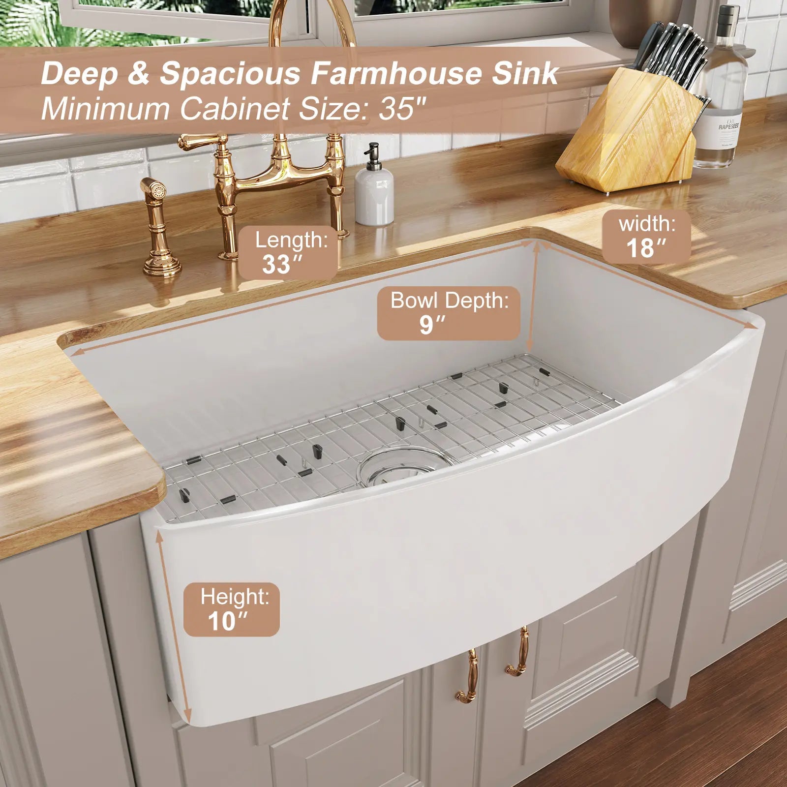 With dimensions of 33" x 18" x 10" and a 9'' center depth, our apron front farm sink offers ample space for large pans and trays. No more awkward angles while washing, and it fits seamlessly into a minimum cabinet base of 36".