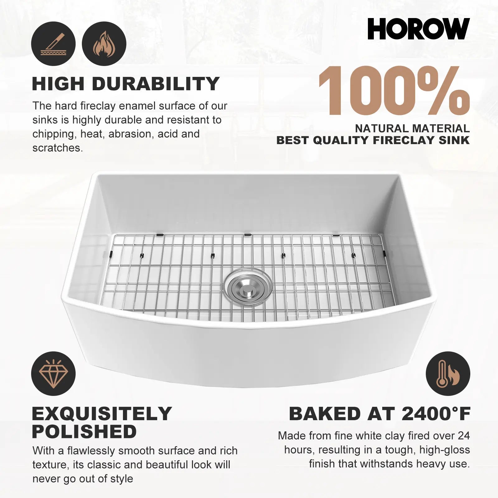 Crafted from true fireclay, this 33-inch white sink undergoes firing at 2900 °F for exceptional strength, durability, and impact resistance. Designed to resist yellowing, the surface is extremely chip, heat, abrasion, acid, and scratch-resistant, addressing common issues faced by traditional sinks.