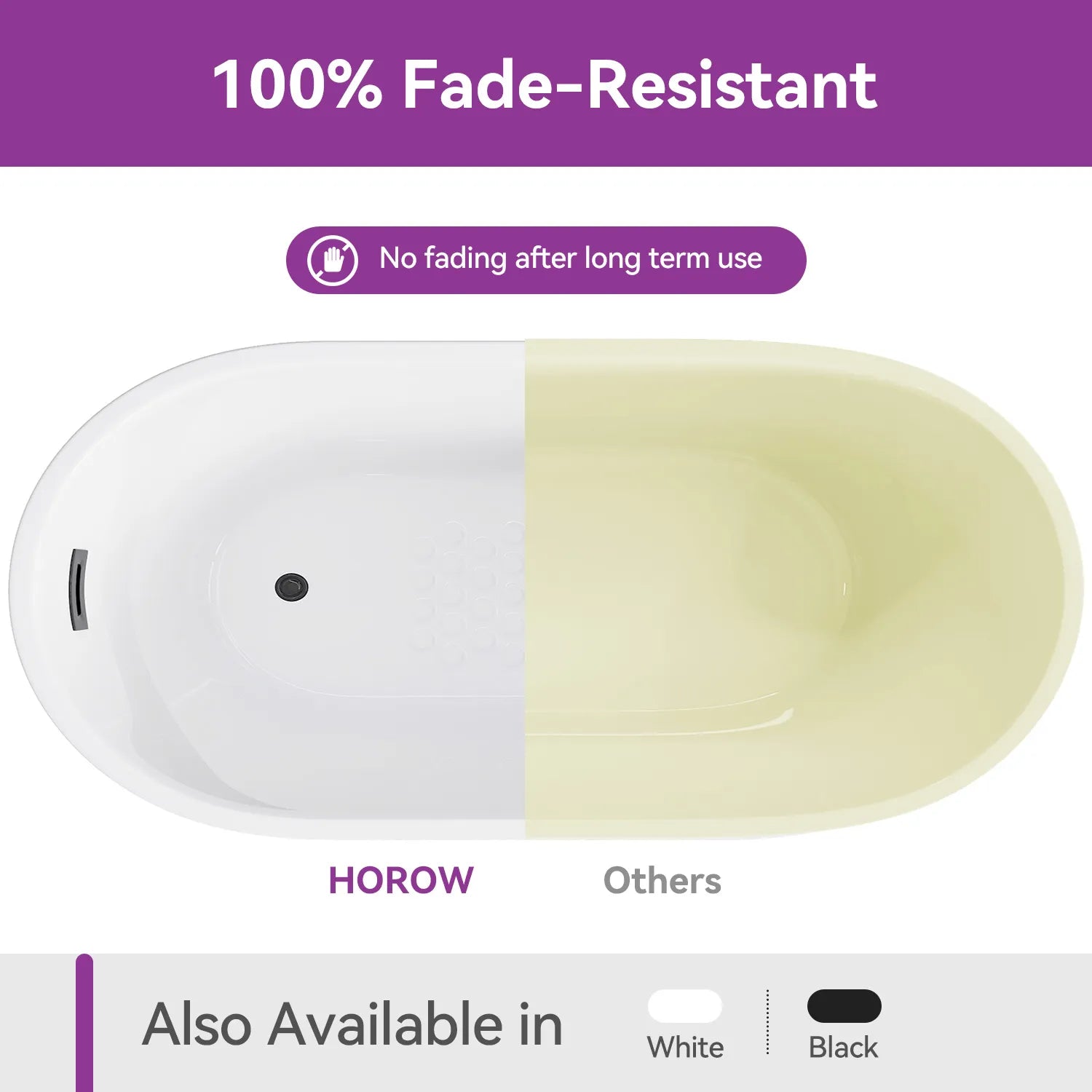 The HOROW TU59B 59-Inch Freestanding Bathtub combines modern elegance with practical design. Crafted with a sleek black exterior, this soaking tub adds sophistication to any bathroom. Its compact 59-inch size makes it perfect for small to medium spaces, while the freestanding design allows for versatile placement. The ergonomic shape ensures optimal comfort during long, relaxing soaks. Constructed from durable, easy-to-clean materials, it resists scratches and stains for lasting beauty. Featuring a convenient left-side drain, it simplifies installation and enhances usability. Whether you're upgrading your space or creating a spa-like retreat, the TU59B bathtub delivers both style and functionality.