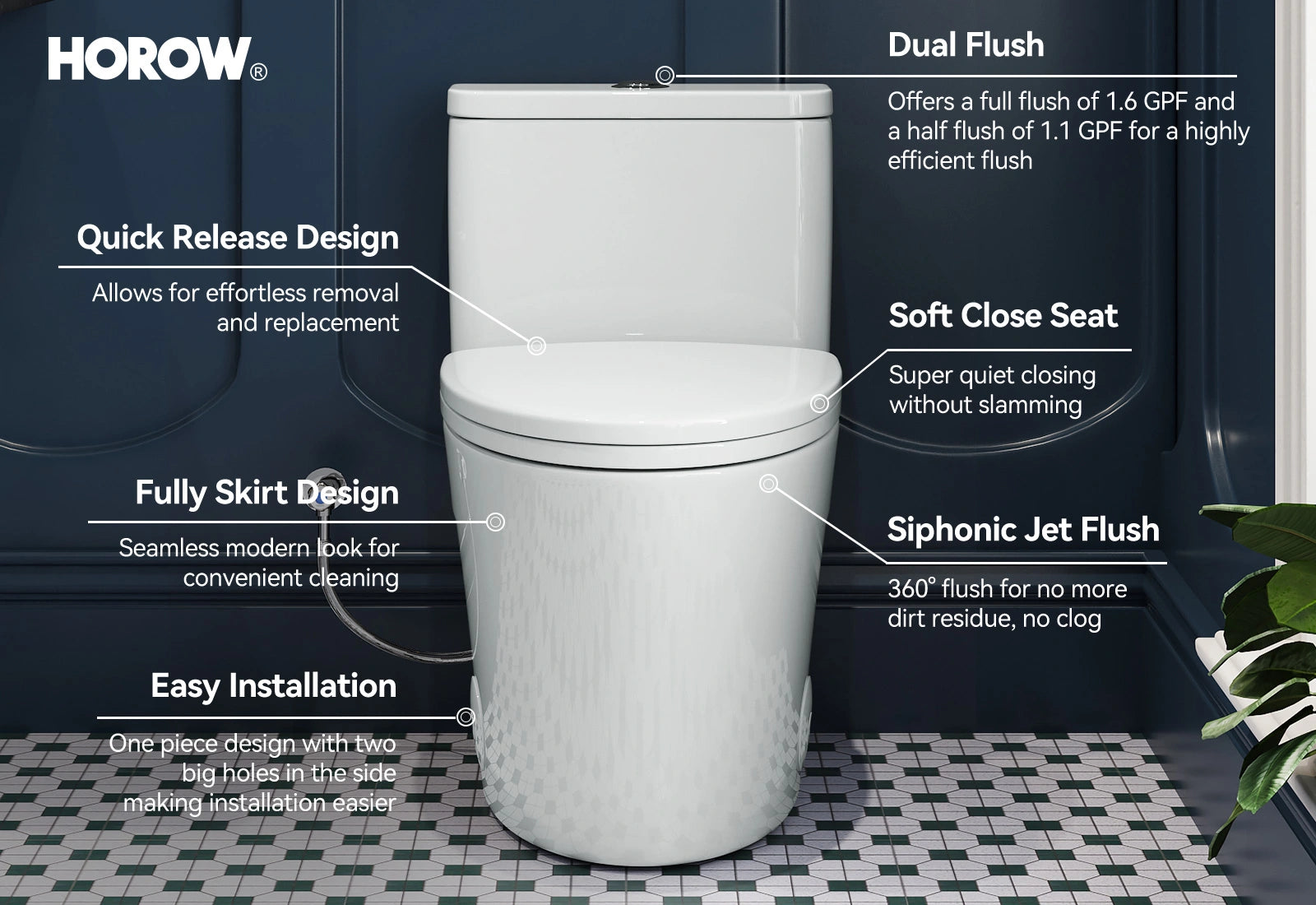 The HOROW T0307W Toilet features a modern full-skirted design, powerful siphonic jet flush, and a soft-close seat for quiet use. Its dual flush system (1.1/1.6 GPF) ensures efficient water savings without compromising performance.