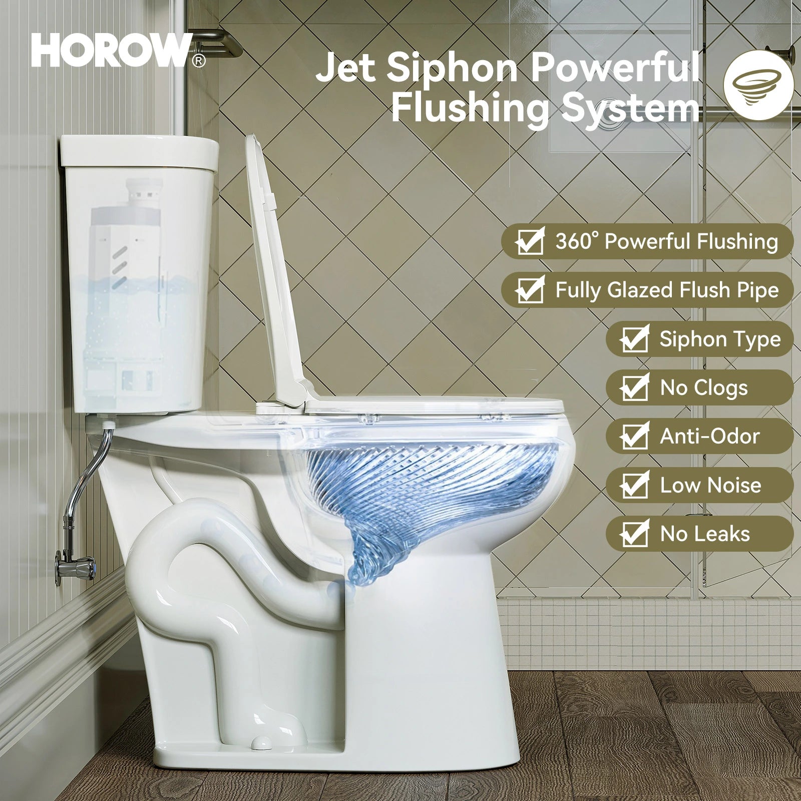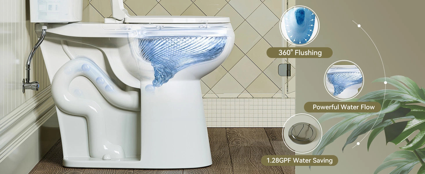 The high-efficiency toilet features an advanced 360° Jet Siphon dual-flush system. With a simple press of the flush button, you can choose between a water-saving partial flush or a powerful full flush, effectively clearing waste and preventing odors while keeping the bowl fresh and clean.