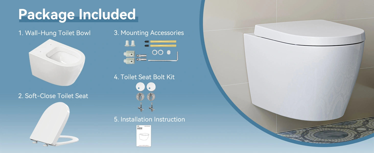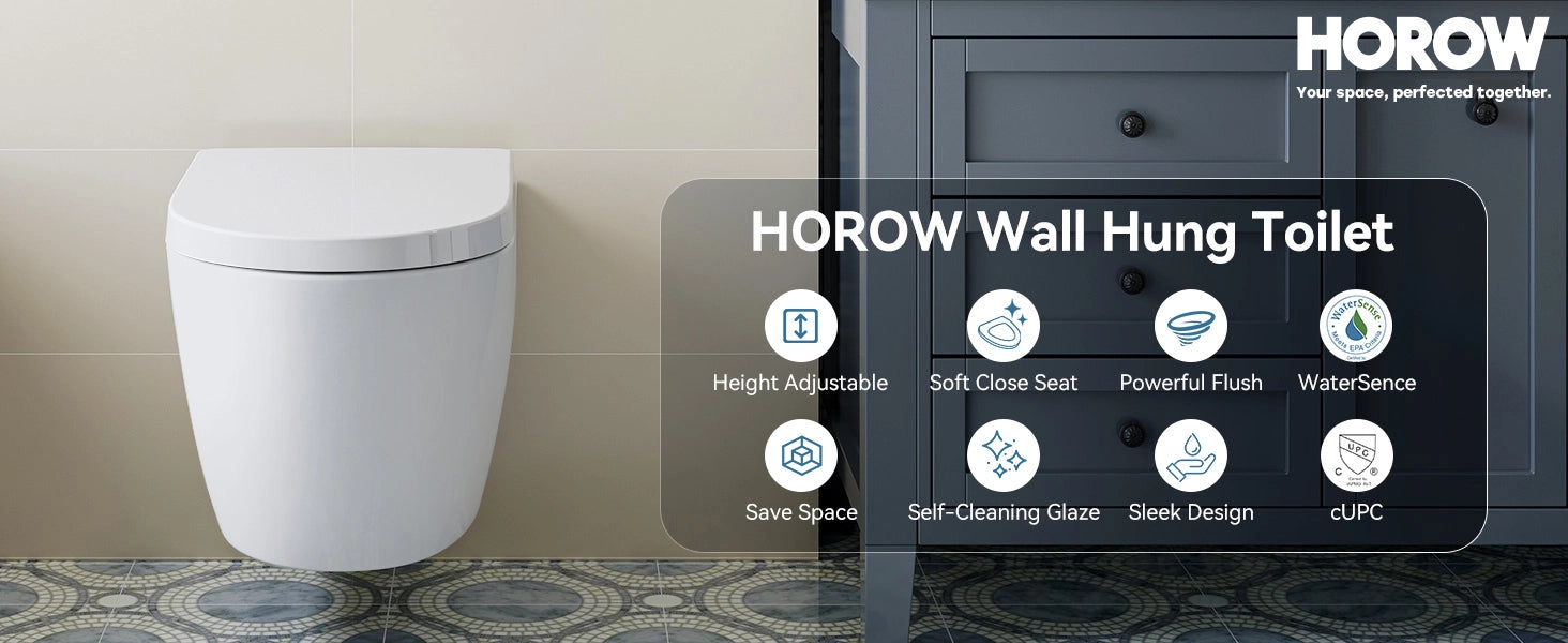The HOROW TG03W wall-mounted toilet offers a sleek, space-saving design perfect for small bathrooms. It features a soft-closing seat and a full-skirted trapway for easy cleaning. For optimal performance, pair it with a compatible in-wall tank system (sold separately).